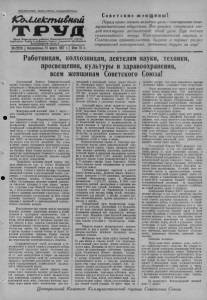 ПРОЛЕТАРИИ ВСЕХ СТРАН, СОЕДИНЯЙТЕСЬ! Сове т ские женщины! Перед нами стоит великая цель—построение коммунистического общества. Все усилия советских людей посвящены достижению этой цели. Еще теснее сплачивайтесь вокруг Коммунистической партии и Советского правительства, будьте в первых рядах _ _ _ _ _ _ _ _ __ строителей коммунизма, активных борцов за мир! 30 (2218) j Воскресенье, 10 марта 1597 г.| Цнеа 15 н, Работницам, колхозницам, деятелям науки, техники, просвещения, культуры и здравоохранения, всем женщинам Советского Союза! $СЬилекхтш&шй Орган Карасукского райкома Коммунистической партии Советского Союза и районного Совета депутатов трудящихся Новосибирской области________ _ Центральный Комитет Коммунистической партии Советского Союза горячо приветствует и поздравляет с Международным женским днем работниц и колхозниц, ийженеров и техников, строителей и служащих, учителей и врачей, деятелей литературы и искусства, всех советских женщин, несущих трудовую вахту на различных участках народного хозяйства страны, пенсионерок, ветеранов труда, всех матерей, отдающих свои силы воспитанию детей. Международный женский день 8 марта — день солидарности трудящихся женщин всего мира. Празднование Международного женского дня совпадает в этому году с подготовкой к всенародному празднованию 40-летия Великой Октябрьской социалистической революции. Советский народ с огромным воодушевлением борется за осуществление задач коммунистического строительства, поставленных историческим XX съездом КПСС, за выполнение и перевыполнение плана второго года шестой пятилетки. Все новые и новые отряды трудящихся включаются в социалистическое соревнование в честь 40-й годовщины Октября. Наша Родина вступает в пятое десятилетие существования Советского государства 'могучей непобедимой державой, уверенно идущей вперед по пути коммунизма. Трудящиеся женщины нашей страны сыграли выдающуюся роль в победе Октябрьской революции, открывшей новую эру в истории человечества. Тысячи и тысячи женщин -“’проявляли подлинный героизм в революционной борьбе с царизмом, с господством помещиков и капиталистов, на баррикадах Октября, в битвах гражданской войны. Бесиримериые трудовые подвиги совершили советские женщины в годы первых пятилеток, в суровые годы Великой Отечественной войны, в послевоенный годы восстановления и дальнейшего развития экономики и культуры. Успехи социалистического строительства на всех этапах развития Советского государства неразрывно связаны с активной и самоотверженной деятельностью советских женщин. Коммунистическая партия всегда придавала большое значение вовлечению женщин в хозяйственное и культурное строительство. Еще в 1919 году великий Ленин указывал, что только тогда, когда миллионы и миллионы женщин примут участие в деле, начатом Советской властью, «социалистическое строительство будет стоять в России так прочно, что никакие внешние враги в других странах и внутри России не будут Советской республике страшны». Верные "заветам Ленина советские женщины отдают все свои силы строительству коммунистического общества. Социалистический строй, возникший и утвердившийся в нашей стране в результате победы Октябрьской революции, принес женщинам раскрепощение, свободу, равноправие. Он освободил их от оков эксплуатации и открыл им 