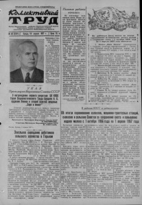 ПРОЛЕТАРИИ ВСЕХ СТРАН, СОЕДИНЯЙТЕСЬ! Орган Kapacj'HCHoro райиома Коммунистической партии С ов ет ск ого С ою за и районн ого Совета депутатов трудящ ихся Н овосибир ской области №43 (2231)| Среда, 10 апреля 1957 г. | Цена 15 к, Брошюра с текстом тезисов доклада тов. Н. С. Хрущева Г о сударствен- ное издательство политической ли тературы выпустило брошюру с текстом тезисов доклада тов. Н. С. Хрущева , 0 дальнейшем совершенствовании организации управления п р о м ы ш л е н - ностью и строите л ь с тв о м о п у бликованных в печати по решению ЦК КПСС и Совета Министров СССР для всенародного обсужде нич. Брошюра издана тиражом Iмиллион экземпляров (ТАСС). ' У К А З Президиума Верховного Совета СССР Онаграждении первого секретаря ЦК КПСС Героя Социалистического Труда Хрущева Н. С. орденом Ленина и второй золотой медалью „Серп и молот" Полевые работы начались На колхозные поля пришла весна. Вчера наша тракторная бригада на полях колхоза им. Жданова приступила к задержанию талых вод. Для того, чтобы вешние воды не стекли в низменные места, механизаторы поперек склонов земельных массивов нарезают валки. Первым в эту работу включился водитель „НАТИ“ Петр Матвеев. 9 апреля при норме 40 гектаров т. Матвеев задержал талые воды на площади около 50 гектаров. Сегодня на задержание талых вод выходят еще два гусеничных трактора. Весенне-полевые работы мы рассчитываем провести в сжатые агротехнические сроки. Необходимые условия для этого имеются: качественно отремонтированы трактора, подготовлен сельскохозяйственный инвентарь.Брига- да укомплектована трактористами, прицепщиками и другим обслуживающим персоналом. Добросовестно потрудился плотник В. Коваленко на ремонте тракторного вагончика. Членам бригады создано уютное жилище. П. ЛАНГ, бригадир тракторной бригады Чернокурьинской МТС. ^ Н а р а й о н н ую Д о с к у п о ч е т а н о итогам ^ I с о р е в н о в а н и я з а п о вы ш ен и е н а д о е в м ол ок а j и с о х р а н е н и е с к о т а с 1 ок т я б р я 1 9 5 0 г о д а • н о 1 а п р е л я 1 9 5 7 г о д а з а н о с я т с я : * 1. Колхоз „Маяк Ильича" (председатель j т. Горелов, секретарь парторганизации т. Расска I зов). Средний надой на фуражную корову за 6 j месяцев составил 625 литров, в том числе за март ! 260 литров. 2. Карасукская МТС (директор МТС т. Зай- j цев, секретарь РК КПСС по зоне т. Барило, сек- : ретарь парторганизации т. Титоренко, гл. зоотех- | ник т. Давиденко). Надой молока в обслуживае- | мых колхозах за 6 месяцев на фуражную корову J составил 530 литров, в том числе за март 205. • 3. Михайловский сельский Совет (председа- I тель сельсовета т. Рассказов). В колхозах, подчиненных сельсовету, средний надой на фуражную j корову за полугодие составил 616 литров. 4. Шатохину Н. Я., доярку колхоза „Маяк I Ильича1, надоившую за 6 месяцев от каждой фу- , ражной коровы по 820 литров. I 5. Зайнулину М., доярку колхоза „ЖолСта- J лина“, надоившую за полугодие по 818 литров на | фуражную корову. 6. Черченко Л. С., доярку колхоза „Маяк > Ильича", надоившую за 6 месяцев от каждой ко- I ровы по 789 литров. 7. Ульман М. А., доярку колхоза „Путь Ле- I нина", надоившую от каждой фуражной коровы по 762 литра. | 8. Фаберт М. А. доярку колхоза им. XX ! партсъезда, надоившую за полугодие от каждой I фуражной коровы по 720 литров молока. ^ Отмечая выдающиеся заслуги первого секретаря Центрального Комитета КПСС товарища Хрущева Н. С. в разработке и осуществлении мероприятий по осв