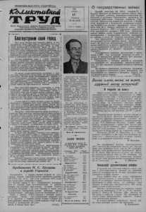 2. КОЛЛЕКТИВНЫЙ ТРУД 12 апреля 1957 года, № 44 Д а д и м л ю б и м о й Р о д и н е так решили механизаторы механизаторов Слово б апреля в Октябрьской] МТС состоялось общее собрание рабочих, служащих и специалистов сельского хозяйства совместно с руководителями колхозов. На собрании с докладом «О результатах хозяйственной деятельности МТС за 1956 года и задачах на 1957 год» выступил директор станции т. Арсенов. Большой вклад в дело укрепления и развития колхозов зоны вложил коллектив ОктябрьскойМТС. В зимний период на полях колхозов проводились агротехнические мероприятия, в лучшие сроки и с высоким качеством выполнялись весенне-полевые работы. На уборке урожаяшироко применялся раздельный 'способ. Все это позволило собрать со всей площади посева по 10,8 центнера зерна. За последние годы освоено около 9 тысяч целинных и залежных земель. Лучших результатов на уборке урожая добилась тракторная бригада т. Семенихина. Здесь на 15 - сильный трактор намолочено почти по 2 тысячи центнеров зерна, сдано государству по 1237 центнеров. Поэтим показателям тракторная бригада занимает первое место в МТС. По выработке на трактор зерна и сдаче его государству среди колхозов впереди идет сельхозартель имени Джамбула. Здесь на ?каждый 15- сильный трактор намолочено по 1429 центнеров зерна* и сдано государству 'по 923 центнера. За успехи, достигнутые в освоении целинных и залежных земель, производстве зерна и сдаче его государству, большая группа механизаторов МТС награждена орденами и медалями. Высшими правительственными наградами орденомЛенинанаграждены тракторист Семен Яковлевич Мурашко и комбайнер ^Федор Федорович Шнайдер. Сейчас тракторные бригады выехали на усадьбы колхозов. Нынче они решили бороться Знатный механизатор Октябрьской МТС комбайнер Федор Федорович Шнайдер за высокие показатели на уборке урожая 1956 года награжден орденом Ленина. На снимке: комбайпер Ф, Ф . Шнайдер. за урожай с каждого гектара не менее 14 центнеров зерна. Имеются некоторые положительные результаты в животноводстве. Колхозы зоны увеличили надои за год в среднем на фуражную корову на 89 литров больше, чем в предыдущем году. Передовые доярки зоны Елизавета Шайдеман, НинаСамохвалова, Сарвуар Бекниязева получили от каждой фуражной коровы более чем по 20 центнеров молока. Прирост молока получен и за 6 месяцев нынешнего хозяйственного года. Впереди идет колхоз имени XI партсъезда.Здесь на одну фуражную корову надоено по 625 литров. Однако в развитии животноводства имеются существенные недостатки. Плохо поставлено племенное дело. Запущен учет случки и отела коров. На фермах слабо внедряется механизация трудоемких процессов, часть приобретенных доильных аппаратов ржавеет без дела и выходит изстроя. Колхозы зоныещемало производят молока и мяса на каждые 100 гектаров сельхозугодий, содержат недостаточное количество коров. Плохо вколхозах занимаются укреплением кормовой базы для скота. Каждый член правления признает высокие качества кукурузного силоса, однако квыращиванию иуборке кукурузы относятся плохо. Обынчо на уборку выделяется недостаточное количество транспорта, в следствие чего каждую силосную яму закладывают по несколько дней, в результате качество силоса снижается. Значительнаячасть выращеной в прошлом году кукурузы осталась не убранной. Выступившие в прениях механи