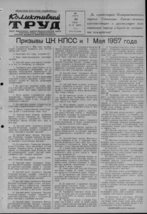 2. КОЛЛЕКТИВНЫЙ ТРУД 24 апреля 1957 года, № 49 I Призывы ЦК КПСС I н 1 Мая 1957 года I 55. Работники сельского хозяйства! Бори- I тесь за дальнейший подъем зерноього хозяйства! I 56. Работники сельского хозяйства! Успеш- I но проведем весенний сев 1957 года, добьемся I высокого урожая! I 57. Работники сельского хозяйства! Все- | мерно развивайте общественное животноводство I и повышайте продуктивность скота! Дадим стра- I не больше продуктов животноводства! I 58. Труженики целинных земель! ЗакрепI ляйте достигнутые успехи в освоении целины, I добивайтесь высоких и устойчивых урожаев зер- I на, развивайте животноводство! Слава тружени- I кам освоения целинных земель! I 59. Работники машинно-тракторных станций! I Лучше используйте передовую технику! Боритесь I за повышение урожайности сельскохозяйствен- I ных культур и продуктивности животноводства! I 60. Работники совхозов! Превратим все I совхозы в образцовые высокотоварные и рента- I бельные предприятия! I 61. Работники торговли и общественного питания! Боритесь за высокую культуру обслуживания, полнее удовлетворяйте потребности трудящихся! 62. Работники советского транспорта! Обеспечивайте бесперебойную перевозку грузов! Улучшайте обслуживание пассажиров! Настойчиво внедряйте новую технику! 63. Работники советских учреждений! Улучшайте работу советского аппарата! Решительно искореняйте бюрократизм и волокиту, чутко относитесь к запросам и нуждам трудящихся! 64. Работники советской науки и высших учебных заведений! Повышайте роль науки в техническом прогрессе, улучшайте подготовку специалистов! 65. Деятели литературы и искусства! Умножайте духовные богатства страны! Боритесь за высокую идейность и художественное мастерство произведений искусства! 66. Работники народного просвещения! Повышайте качество обучения детей, боритесь за политехнизацию школы! Воспитывайте молодое поколение в духе любви и преданности Советской Родине, делу коммунизма! 67. Медицинские работники! Улучшайте и развивайте народное здравоохранение, повышайте культуру в работе лечебных и санитарных учреждений! Внедряйте в практику достижения медицинской науки! 68. Советские профсоюзы! Развивайте творческую активность трудящихся, шире вовлекайте рабочих в управление производством! Неустанно заботьтесь о дальнейшем подъеме материального благосостояния и культурного уровня рабочих и служащих! 69. Да здравствуют советские женщины— активные строители коммунизма! 70. Да здравствует Всесоюзный Ленинский Коммунистический Союз Молодежи— верный помощник и резерв Коммунистической партии, передовой отряд молодых строителей коммунизма! 71. Юноши и девушки! Будьте достойными сынами и дочерьми нашего великого народа, неутомимыми строителями коммунизма! 72. Пионеры и школьники! Будьте трудолюбивы и дисциплинированны! Упорно и настойчиво овладевайте знаниями! Готовьтесь стать активными борцами за дело Ленина! 73. Коммунисты и комсомольцы! Будьте в авангарде всенародной борьбы за выполнение решений XX съезда КПСС, за построение коммунизма в СССР! : 74. Да здравствует Союз Советских Социалистических Республик— твердыня дружбы народов нашей страны, несокрушимый оплот мира во всем мире! 75. Да здравствует великий советский народ-строитель коммунизма! 76. Да здравствует Коммунистическая партия Советского Союза— великая вдохновляющая и руководя