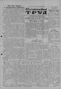 2, КОЛЛЕКТИВНЫЙ ТРУД 10 мая 1957 года, № 55 Седьмая сессия Верховного Совета СССР 7 мая в Москве, в Большом Кремлевском Дворце открылась VII сессия Верховного Совета СССР четвертого созыва. Состоялись заседания Совета Союза и Совета Национальностей. На заседаниях были утверждены доклады мандатных комиссий о выборах депутатов, избранных взамен выбывших. Совет Союза и Совет Национальностей утвердил следующую повестку дня сессии: 1. О дальнейшем совершенствовании организации управления промышленностью и строительством. 2. Утверждение Указов Президиума Верховного Совета СССР. Доклад решено заслушать на совместном заседании Совета Союза и Совета Национальностей Верховного Совета СССР. Совместно будет проводиться также утверждение Указов Президиума Верховного Совета СССР. Во второй половине дня на совместном заседании Совета Союза и Совета Национальностей Верховного Совета СССР с докладом о дальнейшем совершенствовании организации управления промышленностью и строительством выступил теп ло встреченный присутствую щими Первый Секретарь Цент рального Комитета КПСС депутат Н. С. Хрущёв. ва, бюрократических методов руководства, консерватизма. Депутат Н. Т. Кальченко (Украинская ССР) говорит, что трудящиеся республики с большим воодушевлением встретили решения февральского Пленума ЦК КПСС и тезисы доклада тов. Хрущева. Рабочие, колхозники, интеллигенция Украины единодушно одобрили их. Тов. Кальченко сообщил далее, что в республике намечается создать 11 экономических административных районов. В связи с этим намечается ликвидировать 13 министерств. Значительную часть предприятий ликвидируемых министерств и ведомств и более 160 строительных организаций Украины намечается передать в подчинение исполкомам областных Советов. Тов. Кальченко вносит предложение одобрить мероприятия по перестройке управления промышленностью и строительством, намеченные в докладе тов. Хрущева. В райкоме ВЛКСМ Об инициативе комсомольской организации Октябрьской семилетней школы Горячий отклик в сердцах комсомольцев и учащихся школ района нашел призыв Центрального Комитета ВЛКСМ к молодым кУкУРУЗоводам. Комсомольцы и учащиеся Октябрьской семилетней школы первыми в районе включились в соревнование молодых кукурузоводов, решив собрать по 400 центнеров зеленой массы с каждого гектара. Они создали производственные бригады, а колхоз выделил им участок в четыре гектара. Учащиеся Октябрьской семилетней школы выступили с обращением ко всем школьникам района последовать их примеру и смелее взяться за выращивание кукурузы и картофеля на больших площадях. Призыв октябрьцев нашел горячий отклик во многих школах района. Комсомольцы Хо- рошинской средней школы совместно с несоюзной учащейся молодежью, взвесив свои возможности, решили нынешним летом вырастить на 30 гектарах кукурузу и на 15 гектарах картофель. Учащиеся Карасартовской средней школы взялись посадить, вырастить и убрать картофель на площади 10 гектаров и кукурузу на 20 гектарах. Каждый день в поход за выращивание высоких урожаев кукурузы и картофеля на больших площадях включаются все новые школы и коллективы учащихся. Бюро райкома комсомола одобрило инициативу комсомольцев и несоюзной учащейся молодежи Октябрьской семилетней школы, бросившей клич к школьникам района включиться в поход