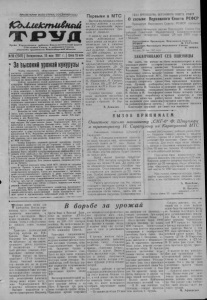 ПРОЛЕТАРИИ ВСЕХ СТРАН, СОЕДИНЯЙТЕСЬ) KbUjuJcmu&mu Оргии Fupacj'KCKoro -райкома Коммунистической партии Советского Союза и районного Совета депутатов трудящихся Новосибирской области №59 (2247) | Воскресенье, 19 мая 1957 г. | Цена 15 коп. ■Завысокийурожайкукурузы *, Чтобы обеспечить общественное животноводство в я достатке сочными молокогонными кормами, работники колхозов, совхозов и МТС района запланировали нынче посеять 9600 гектаров кукурузы и получить с каждого гектара не менее 200 центнеров зелёной массы. Сейчас труженики полей включились в массовый сев кукурузы. Передовые машинисты квадратно гнездовых сеялок используют на севе весь световой день и намного перевыполняют сменные нормы. По 15—17 гектаров засевает в день машинист т. Кулямпин из Карасукской МТС. Всемерной поддержки заслуживает начавшееся соревнование посевных агрегатов Ф. Штумпфа, Н. Сарапулова из колхоза „Вперед к коммунизму1* и И. Бычкова, А. Михейлиса из колхоза имени XX партсъезда. В основу соревнования они положили: выполнять ежедневно не менее двух сменных норм, получить правильные квадраты и вырастить высокий урожай зелёной массы. Это обязательство уже с первых дней работы подкрепляется практическими делами. Впереди по севу кукурузы идёт Октябрьская МТС. Здесь уже засеяно квадратами более 700 га. Почти по 200 гектаров кукурузы посеяно в колхозах имени XX партсъезда и им. Молотова. Однако в ряде хозяйств района с севом кукурузы все еще медлят. Ни один колхоз зоны Хорошинской МТС не приступил к севу кукурузы. Больше того, здесь еще не все сеялки находятся в бригадах. А между тем по МТС запланировано посеять почти полторы тысячи гектаров. Не приступил к севу кукурузы колхоз „Новая семья** Черно- курьинской МТС. Медленно включаются в сев кукурузы и другие колхозы этой зоны. Не включились в сев^ кукурузы оба совхоза, хотя они должны вырастить её оолее чем на 3000 гектарах. Чтобы получить хороший урожай кукурузы, нужно качественно провести сев ее: по хорошим почвам и соблюсти правильные квадраты. Другим важным этапом является уход за кукурузой. Для этого во всех хозяйствах должны быть созданы кукурузоводческие звенья. Но с созданием этих звеньев у нас дело обстоит из рук вон плохо. Так, руководители Чёрнокурьинской МТС считают, что у них в колхозе имени Куйбышева создано три звена по выращиванию кукурузы. Эти звенья, правда, созданы, но только на бумаге. В других колхозах зоны этой МТС звенья не созданы даже на бумаге. А ведь их следует не только создать, но и организовать обучение членов звеньев агротехнике возделывания кукурузы. Такое же положение с организацией кукурузоводческих звеньев в ряде колхозов зоны Карасукской и некоторых других МТС. Не может серьезно вестись разговор о выращивании высокого урожая кукурузы там,где не созданы кукурузоводческие звенья. Необходимо уже сейчас готовить машины для междурядной обработки кукурузы. Задача тружеников сельского хозяйства, руководителей колхозов, МТС и совхозов и секретарей парторганизаций— обеспечить качественный посев кукурузы в лучшие сроки и организовать заботливый уход за ней. Первыми в МТС Высокими темпами ведет полевые работы в колхозе им. XX партсъезда тракторно-полеводческая бригада И. Довгаля. К началу мая механизаторы подготовили под посев почти все поля и это позволило им в сжатые сроки провести сев зерновых культ