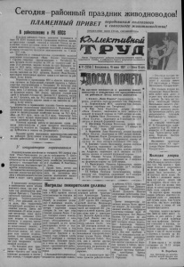 Сегод]ня—районный праздник живодноводов! ПЛАМЕННЫЙ ПРИВЕТ передовикам колхозного и совхозного животноводства! В райисполкоме и PH КПСС , РаЙ0НН0Г0 Совета депутатов трудящихся и бюро Fit iU iLL подвели итоги соревнования колхозов машинно-тракторных станций, совхозов и сельских Советов по выполнению планов поголовья скота и птицы, производства продукции животноводства, сохранению молодняка и выполнению поставок государству продуктов животноводства за 5 меся-1 цев 1957 года. Первенство в социалистическом соревновании колхозов присуждено сельхозартели «Маяк Ильича» (председатель т. горелов, секретарь парторганизации т. Рассказов). За пять месяцев колхоз получил на 100 га сельхозугодий молока 25,4 центнера, надоено молока на одну фуражную корову по 1021 литру, добился сохранения телят 95,7 проц. ягнят 98,7, поросят 100 процентов, годовой план сдачи молока выполнен на 58,8 процента. Колхозу «Маяк Ильича» присуждено переходящее красное знамя и он занесен на районную Доску почета. Первенство в соревновании МТС в области животноводства признано за Карасукской станцией (директор т. Зайцев секретарь парторганизации т. Титоренко). По колхозам зоны станции получено на 100 га сельхозугодий молока 23 центнера, мяса 1,2 центнера, яиц— 542 штуки, надоено молока на фуражную корову 846 литров, выполнен годовой план сдачи и продажи государству мяса на 21,5 процента, молока на 44,7 процента, яиц на 60,3 процента. Карасукской МТС вручено переходящее красное знамя и она занесена на районную Доску почета. Первенство в соревновании сельских Советов присуждено Чуманскому сельисполкому (председатель т. Корнюшин), обеспечившему выполнение плана обязательных поставок ' и закупок по индивидуальным хозяйствам молока на 72,5 проц. яйца—на 30,1 проц., мяса—на 21,4 проц,. Чуманскому сельскому Совету вручено переходящее красное знамя и он занесен на районную Доску почета. Отмечена хорошая работа по выполнению плана развития животноводства и сдачи продуктов животноводства государству колхозов им. Тельмана, «Вперед к коммунизму» им. Куйбышева и совхоза им. Дзержинского. Большая группа передовиков животноводства занесена на районную Доску почета и награждена Почетными грамотами райисполкома и ценными подарками. У инициаторов соревнования Индивидуальные хоз»йства села Ново-Николаевки успешно выполняют принятые обязательства по досрочному расчету с государством по натуральным поставкам продуктов животноводства. Большинство молокосдатчи- ков уже полностью рассчитались с обязательными поставками и ведут сдачу молока в госзакуп. 900 литров про- дала государству П. Шост, более 8 центнеров от каждого хозяйства заготовлено от У. Алейник, В. Хвостенко, А. Киба. Кроме того, почти все хозяйства досрочно рассчитались по поставкам яиц, многие колхозники выполнили план сдачи молока. СОЕДИНЯЙТЕСЬ! ^b%lj£jcnui£Hsai Орган Карасукского райкома.Коммунистической партии Советского Союза и районного Совета депутатов трудящихся Новосибирской области №71 (2259) 1 Воснресенье, 16июня 1957 г.*|Цена 15 коп, 4^ - jL- За высокие показатели в развитии мшвот- щ новодства и повышении его продуктивности на районную Доску почета заносятся: 1. Колхоз „Маяк Ильича" (председатель т. Горелов, секретарь парторганизации тов. Рассказов). 2. Карасукская МТС (директор тов. Зайцев, секретарь партбюро юв Титоренко). 3. Ена Анна Корнеевна, доярка