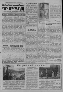 ПРОЛЕТАРИИ ВСЕХ СТРАН, СОЕДИНЯЙТЕСЬ! Орган Карасукского райкома Коммунистической партии Советского Союза и районного Совета депутатов трудящихся Новосибирской области №77(2265)) Воскресенье, 30июня 1957 г. [Цена15коп. Выполнили Вступив во всенародное социалистическое соревнование за резкое увеличение производства продукции животноводства и борясь за достойную встречу 40-й годовщины Великого Октября, многие колхозы района успешно выполняют государственные планы заготовок и закупок продукции животноводства. По состоянию на 28 июня годовой план государственных поставок шерсти выполнило 5 колхозов. 44 центнера шерсти вместо 43 сдал колхоз им. Максима Горького (председатель т. Горбунов), на 5 центнеров перевыполнил годовой план колхоз им. Жданова (т. Головин), колхоз «Вперед к коммунизму» (т. Кравцов) сдал выше годового плана 24 центнера шерсти. Колхоз «Путь Ленина»(председатель т. Русинов) сдал с весеннего настрига 102 центнера шерсти тонкорунных овец, что на 17 центнеров больше годового государственного плана. * * годовой план Больше других артелей района сдал шерсти колхоз им. Тельмана—10800 килограммов, более чем в два раза перевыполнив годовой план. Большая заслуга в досрочном выполнении и перевыполнении годового плана поставок шерсти принадлежит колхозным чабанам, всем другим работникам овцеферм и стригалям. В большинство из этих артелей настриги шерсти с каждой овцы составляют по 3,5 килограмма и более, а с отдельных валухов получено шерсти до 5 килограммов. Большие возможности по сдаче шерсти государству имеет колхоз им. Куйбышева (председатель тов. Трупов;. Здесь на колхозных складах имеется большое количество шерсти, однако с отправкой её на заготовительные пункты медлят. Плохо рассчитываются с государством по поставкам шерсти колхозы им. Калинина, им. Молотова, им. Андреева. * С ЛУГОВ-HA ФЕРМЫ Раннее утро. Под первыми лучами солнца еще серебрятся капли росы, а комсомольцы Николай Томилов и Иван Воисти- нов уже на лугу. Запряжены лошади, проверены машины, и трудовой день начался. За работой незаметно проходит день. А вечером бригадир сообщает, что Н. Томилов и И. Воистинов скосили по шесть гектаров трав. Для начала не так уж плохо—норма на конную сенокосилку 5 гектаров. С пометкой „передовики сегодняшнего дня“ значатся в записной книжке бригадира и имена многих комсомольцев- скирдовщиков. По 22 центнера на расстояние 8 километров подвозят к фермам Николай Ефремов, Яков Никифоров, Георгий Акимов, Николай Шуршиков, Петр Рогожин и Владимир Фрицлер. Всего с лугов на фуражные склады колхоза доставлено 700 центнеров питательного сена. С огоньком трудятся на лугах молодые колхозники артели имени Тельмана. Пример в работе показывают комсомольцы. К. Чебаков. За два дня— 200 центнеров Наша бригада приступила к сенокошению с некоторым опозданием, но с первых же дней коллектив трудится с нарастающими темпами, чтобы наверстать упущенное время. Тракторист Николай Миленке на «ДТ-54» сцепом четырех сенокосилок за три дня скосил травы с площади 130 гектаров. На следующий день началось сгребание, копнение и подвозка сена к фермам. На подвозке занято пока три брички и одна автомашина. За два дня колхозники с лугов доставили к местам зимовки скота 200 центиеров сена. На скирдовкс хорошо работают комсомольцы Анатолий Палий, Виктор Ена, молодые колхозники Вла