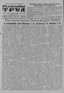 ПРОЛЕТАРИИ ВСЕХ СТРАН, СОЕДИНЯЙТЕСЬ! 1^U j£JC iTU l£H £lU Орган Карасукскго райкома Коммунистической партии Советского Союза и районного Совета депутатов трудящихся Новосибирской области №79 (2267)] Пятница, 5 июля 1957 г. [Цена 15кппИнформационное сообщение о Пленуме Центрального Комитета Коммунистической партии Советского Союза 22-29 июня с. г. состоялся Пленум Центрального Комитета Коммунистической партии Советского Союза. Пленум обсудил вопрос об антипартийной группе Маленкова Г. М., Кагановича Л. М., Молотова В. М. Пленум принял соответствующее постановление, которое сегодня публикуется. Пленум вывел из состава членов Президиума ЦК и из членов ЦК КПСС тт. Маленкова, Кагановича, Молотова; снял с поста секретаря ЦК КПСС и вывел из состава кандидатов в члены Президиума ЦК и из состава членов ЦК т. Шепилова. Пленум избрал Президиум ЦК КПСС в следующем составе: Члены Президиума: тт. Аристов А. Б., Беляев Н. И., Брежнев Л. И., Булганин Н. А., Ворошилов К. Е., Жуков Г. К., Игнатов Н.Г., Кириченко А. И., Козлов Ф. Р., Куусинен О. В., Микоян А. И., Суслов М. А., Фурцева Е. А., Хрущев Н. С., Шверник Н. М.; Кандидаты в члены Президиума: тт. Мухитдинов Н. А., Поспелов П. Н., Коротченко Д. С., Калнберзин Я. Э., Кириленко А. П. , Косыгин А. Н., Мазуров К. Т., Мжаванадзе В. П., Первухин М. Г. Пленум пополнил состав Секретариата, избрав Секретарем ЦК КПСС т. Куусинена О. В. Постановление Пленума ЦК КПСС об антипартийной группа Маленкова Г, М., КагановичаЛ. М., Молотова В. М. г ПленумЦентрального Комитета КПСС на заседаниях 22- 29 июня 1957 года рассмотрел вопрос об антипартийной группе Маленкова, Кагановича, Молотова, образовавшейся внутриПрезидиума ЦК КПСС. В то время, когда партия - под руководством Централь- \ ного Комитета, опираясь на всенародную поддержку, ведет огромную работу по выполнению исторических решений XX съезда, направленных на дальнейшее развитие народного хозяйства и непрерывный подъем жизненного уровня советского народа, на восстановление ленинских норм внутрипартийной жизни, ликвидацию нарушений революционной законности, на расширение связи партии с народными массами, развитие советской социалистической демократии, т на укрепление дружбы совет ских народов, проведение пра пильной национальной полити ки, а в области внешней по литики— на разрядку между- } народной напряженности в целях обеспечения прочного ми ра; и когда достигнуты уже во всех этих областях серьезные успехи, о которых знает каждый советский человек, в это время антипартийная группа Маленкова, Кагановича и Молотова выступила против линии партии. С целью изменения полити ческой линиипартии эта группа антипартийными, фракционными методами добивалась смены состава руководящих органов партии, избранных на Пленуме ЦК КПС. Это не яиилосьслучайностью. В течение последних 3 4 лет, ^ когда партия взяла решительный курс на исправление ошибок и недостатков, порожденных культом личности, и ведет успешную борьбу против ревизионистов марксизма-ленинизма как на международной арене, так и внутри страны, когда партией проведена большая работа по исправлению допущенных в прошлом извращений ленинской национальной политики,—участники раскрытой теперь и полностью разоблаченной антипартийной группы постоянно оказывали прямое или косвенное противодействие этому курсу, одобренному XX съездом КПСС. Эта группа по существу 