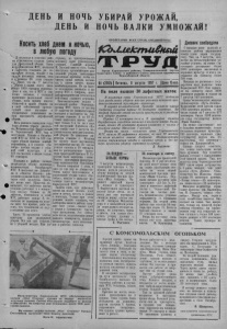 Nr ДЕНЬ И НОЧЬ УБИРАЙ УРОЖАЙ, ДЕНЬ И НОЧЬ ВАЛКИ УМНОЖАЙ! х Косить хлеб днем иночью, в любую погоду Ч*-, Д$ колхозах и совхозах райо на повсеместно созрели хлеба для раздельной уборки. Однакоруководители МТС, колхозов и совхозов, ссылаясь на ненастную погоду, медлят с началам косовицы ячменя, овса и пшеницы. Об этом говорит -то^ факт, что на 7 августа у шжено в валки всего лишь е^коло 1000 гектаров зерновых. Дело в том, что в МТС и совхозах несмело, с оглядкой применяют раздельный способ уборки, хотя пример многих областей и краев страны да и свой собственный прошлогодний опыт наглядно и убедительно доказывают явную выгодность двухфазной I уборки. Весь рыжикв нынешнем году было решено убрать раздельно. Механизаторы Карасукской и Хорошинской МТС так и поступили. Однако в Октябрьской МТС из 1156 га 519 гектаров убрали прямым комбай- нированием, а в совхозе «Октябрь» вообще медлят с уборкой этой культуры, и из 518 га скосили в валки только 68 гектаров. Первыми в районе начали раздельную уборку пшеницы механизаторы Октябрьской МТС. В колхозах им. Джамбула и «Заветы Ильича» уже уложено в валкиболее 200 гектаров этой культуры. Здесь же косят овес. Практика показывает, чтолафетные жатки успешно работают и в ненастную погоду. Однако из 34 лафетов, имеющихся в этой МТС, работает только 8. Остальные не выведенына полосы либо без причин, либо потому, что технически не подготовлены для этого. Здесь 95 процентов хлебов пригодны для раздельной уборки. Все они уже созрели, но с уборкой медлят. Как ни странно, но притормаживают косовицу сами руководители станции. Главный агроном М. Боголей вместо того, чтобы выступить организатором раздельной уборки, выискивает различные причины, чтобы оттянуть сроки начала косовицы, а затем начать прямое комбайнирование. Не на высоте положения оказался и директор МТС т. Сминров, которыйрпимиренчески относится к действиям главного агронома Непозволительно медлит с косовицей хлебов Чернокурь- инская МТС. Здесь до сих пор 10 лафетов неукомплектованы жатками и находятся на территории станции. А из 18 готовых лафетных жаток работают только 8 и то не с полной нагрузкой. Вколхозе «Новая семья» еше 1 августа подошлаполоса овса для раздельной уборки. По указанию директора станции т. Козлова на косьбу были поставлены двелафетныежатки. Но онине успели скосить и 10 гектаров, как по распоряжению бригадира тракторной бригадыН. Го релова были выведены с поля Вместо пресечения самоуправ ства зарвавшегося бригадира т. Козлов смирился с этим, и овес до сих порне убирается. Оченьплохо подготовился к раздельной уборке совхоз «Октябрь», медлят с началом косовицы хлебов механизаторы Карасукской МТС. Задача одна—все лафетные жатки на поля! Косить хлеб днем и ночью, косить в дождь и непогоду. Только при этом условии можно ожидать, что хлеборобынашего района сдержат свое слово—свалят хлеб с корня в ближайшие три-че тыре пятидневки. Это сейчас дело чести, политическаялиния каждого коммуниста, каждого механизатора, всех колхозни KOR и рабочих совхозов. Механизаторы Карасукской МТС, обслуживающие колхоз „Жол Сталина” одними из первых закончили косовицу рыжика. Сейчас весь рыжик подобран из валков и обмолочен. На элеватор уже отправлено около 1000 центнеров рыжика. Нп снимке: шофер колхоза „Жол Сталина” Ерсаин Сексембаев загружает свою машину рыжиком, I 