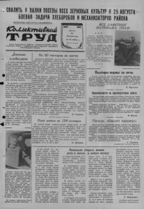 СВАЛИТЬ В ВАЛКИЛОСЕВЫВСЕХЗЕРНОВЫХ КУЛЬТУР К 25АВГУСТА ВОЕВАЛ ЗАДАНА ХЛЕБОРОБОВ ИМЕХАНИЗАТОРОВ РАЙОНА ПРОЛЕТАРИИ ВСЕХ СТРАН, СОЕДИНЯЙТЕСЬ! Юки/екти&тй Т Р У Д Орган Карасукского райкома Коммунистической партии Советского Союза и районного Совета депутатов трудящихся Новосибирской области 1957 1957 АВГУСТ 11 Воскресенье № 95 (2283 ) t Цена 15 копеек Дневник хлебосдачи В районе началась массовая уборка урожая. На элеватор все в больших количествах поступают масличные и зерновые культуры. Всего сдано восемь с половиной тысяч центнеров рыжика, из них полторы ты- рсячи центнеров за 9 августа. Более 1000 центнеров доставлено зерновых культур. По расчетам с государством попрежнему впереди идет Ка- расукская МТС. Колхозы зоны этой станции сдали на элеватор почти 4000 центнеров рыжика. Пополторы тысячи центнеров доставили колхозы «Путь Ленина» и «Маяк Ильича». Отстают по расчету с государством колхозы зоны Черно- курьинской и Хорошинской МТС. Только по 100-150 центнеров сдали на элеватор колхозы «Новая семья», им. Аман- гельды, им. Жданова, 20 центнеров сдал колхоз им. Калинина. Сотни центнеров ячменя 41 рыжика скопились на токах совхоза «Октябрь». Однако на пункт «Заготзерно» сдано только 88 центнеров. Только нынче сел за руль трактора выпускник Андреевского училища механизации Петр Дремов Однако он уже успел себя зарекомендовать примерным работником. Работая на полях тракторнополеводческой бригады т. Кругляка в колхозе им. Тельмана Петр Дремов систематически перевыполняет сменные нормы. Вчера он с машинистом лафетной жатки Михаилом Кругляком выехал в ночную смену на раздельную дюсовицу овса. За ночь этот агрегат скосил 20 гектаров. На снимке: тракторист Петр Дремов за рулем трактора. По 50 гектаров на жатку Широким фронтом развернулись уборочные работы на полях колхоза „Путь Ленина". Здесь ведут косовицу зерновых на свал 10 лафетных жаток. В валки уже уложено более 1200 га зерновых культур. Лучше других организованы уборочные работы в тракторной бригаде коммуниста И. Е. Горбатенко. Механизаторы этой бригады твердо решили все зерновые культуры убрать только раздельным способом. Свое решение коллектив бригады подкрепляет практическими делами. Образцы. труда показывают машинисты лафетных жаток И. Кром и Власов. Вместе с трактористами И. Голенковым и Е. Воронежским они 8 августа скосили за. свою смену по 40 га пшеницы, а 9 августа по 50 га. Набранных темпов механизаторы обязались не снижать. В этой бригаде сейчас работает 4 лафетных жатки. Работа их организована круглосуточно. Агрегаты оборудованы электроосвещением. Машинистами жаток работают комбайнеры и штурвальные. Первыми начали ночную косовицу машинисты А.Бей- фус и Ф. Май и трактористы Май и А. Бендер. Всю ночь на 9 августа их агрегаты работали бесперебойно, и к утру 50 гектаров птеницы лежали в валках. Механизаторы, работающие в колхозе „Путь Ленина", прилагают все усилия, чтобы к 25 августа скосить все зерновые культуры. И. Семенов. Одна жатка на 1200 гектаров На третьей ферме совхоза «Октябрь» почти полторы тысячи гектаров посева зерновых. Большая половина из них уже подошла для раздельной уборки. 220 гектаров низкорослого ячменя поспела для прямого комбайнирования. Для уборки ячменя вышел на поле сцеп комбайнов «С 6», а вот к раздельной уборке здесь до сих пор не приступают. Дело в том, что на оставшиеся 