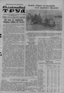 ПРОЛЕТАРИИ ВСЕХ СТРАН, СОЕДИНЯЙТЕСЬ! Дождь уборке не преграда, если дружная бригада! С Орган Карасукского райкома Коммунистической партии Советского Союза и районного Совета депутатов трудящихся Новосибирской области 963(2284) j Среда, 14 августа 1957 г. [Цена 15коп. Все силы на завершение косовицыхлебов к 25 августа В районе идет массовая жатва хлебов. Характерной чертой нынешней страды является решительный уклон в сторону раздельной уборки. На поля колхозов и совхозов вышли десятки лафетных жаток. Хороших результатов добиваются механизаторы Октябрьской МТС. Здесь принято ряд мер по выправлению имевшихся ранее недостатков по определению полей для двухфазной уборки. Сейчас почти все площади зерновых решено убирать раздельно. В ход пущены 28 лафетных жаток. Они косят хлеба круглосуточно. Ежедневный прирост скошенных хлебов здесь составляет более 600 гектаров. Механизаторы Октябрьской МТС стремятся весь хлеб свалить с корня к 25 августа. Уже в первые дни косовицыпередовые механизаторы намного перекрывают сменные нормы выработки. По 40-50 гектаров скашивают в смену машинисты лафетных жаток тт. Кром и Власов с трактористами тт. Голенковым и Воронежским из тракторной бригады т. Горбатенко. Более 30 гектаров в смену скашивают в колхозе им. Джамбула машинист лафетной жатки т. Бер и тракторист т. Гидион. Все лафетные жатки вышли на поля в колхозах зоны Хорошинской МТС. Большинство из них ведет косовицу днем и ночью. Однако темпы косовицы хлебов в целом по району остаются все еще неудовлетворительными. Причиной этого является недооценка в ряде мест раздельной уборки. Прямо против раздельной уборки никто не высказывается, все говорят о ее преимуществах. Но на деле некоторые выжидают, когда хлеба полностью созреют, чтобы пустить на них комбайны. Казалось бы, все механизаторы Ка- расукской МТС должны стоять за раздельную уборку: у них есть богатый опыт прошлого года, да и нынешнего— на рыжике. Однако под разными предлогами здесь сдерживается косовица хлебов, выискиваются причины для оправдания прямого комбайнирования. Врезультате здесь третья часть зерновых убрана прямым комбайнированием. Некоторые бригадиры тракторных и полеводческих бригад вопреки указаниям дирекции МТС загоняют на полосы комбайны. Так, бригадир второй тракторной бригады т. Павленко вместе с полеводческим бригадиром т. Яценко^ начали в колхозе «Маяк Ильича» тремя комбайнами убирать овес, определенный для раздельной жатвы. Большой вред раздельной уборке наносят бракоделы. И хотя жатва началась недавно, уже имеется немало случаев бракодельства. Так, комбайнер Чернокурьинской МТС Кошкин на косовице овса допустил высокий срез—до 30 сантиметров. Рядок получился плохой, овес проваливался. Бригадир тракторной бригады тов. Горелов вместо того, чтобы подправить механизатора, запретил косить раздельно. Машинист лафетной жатки тов. Гоптарь, работая <*- в колхозе им. М. Горького, косил овес не загонками, а вкруговую. В результате на углах мял • нескошенный овес. Эти факты вскрыты, виновные наказаны. Однако этимудовлетворяться нельзя. Надо пресекать факты бракодельства. Скосить все хлеба раздельно к 25 августа— ' такова задача тружеников района За нее должны ооро ться все, настойчиво добиваться повышения производи тельности машин, улучшения качества на косовице и подбор кс хлебо
