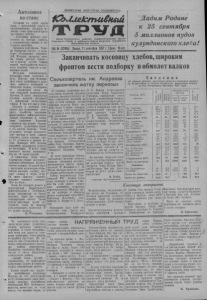 2. КОЛЛЕКТИВНЫЙ ТРУД 11 сентября 1957 года, № 108 Успехи молодых хлеборобов В напряженной борьбе за хлеб достойное участие принимает молодежь нашего района. На всех работах по уборке и транспортировке зерна трудятся юноши и девушки. На полях колхозов и совхозов работают 50 комбайновых агрегатов и лафетных жаток, на которых красуются символы комсомольского значка. Это означает, что агрегаты комсомольско-молодежные. С первых же дней уборки среди них развернулась острая борьба за первенство в районном социалистическом соревновании. Первое место вот уже продолжительное время удерживает агрегат комбайнера Октябрьской МТС Николая Гехта. За последние пять дней он скосил раздельным способом 242 гектара. Ему вручен переходящий красный вымпел и диплом райкома комсомола, а также он премирован ценным подарком. На комбайне красуется табличка— «Лучший молодой комбайнер». К о м с о мольско-молодежные агрегаты Федора Райна из Октябрьской МТС и Дмитрия Токаря из Карасукской МТС занимают в соревновании соответственно второе и третье места. Они также райкомом комсомола удостоены звания «Лучший молодой комбайнер». Им вручены дипломы райкома, а члены агрегатов представлены к награждению почетными грамотами обкома ВЛКСМ. Хорошо работают комсомольско-молодежные агрегаты Ивана Ефимова, Николая Ковалева и Юрия Храмова (Карасукская МТС), Николая Огнатенко, Василия Еременко и В. Чечина (совхоз «Октябрь») На высоких скоростях водят машины с зерном нового урожая многие молодые шофера. Семен Руденко из автороты № 11 на машине «ЗИЛ-585» с начала уборки перевез 17940 центнеров зерна. Он удерживает первенство в соревновании. Ему вручён диплом «Лучшему молодому шоферу». Водители Петр Чайковский (авторота № 11) и Александр Агарков (база «Рос- совхозтранс») представлены к награждению почетными грамотами обкома комсомола. Следует сделать упрек комсомольским организациям автороты №11 (секретарь т. Усенко) и автобазы «Россовхоз- транс» (секретарь т. Зайцев), которые еще слабо занимаются соревнованием молодых шоферов. Молодежь нашего района все сделает для того, чтобы в сжатые сроки и без потерь убрать выращенный урожай, досрочно рассчитаться с государством по хлебопоставкам. Ю. Стрижов, секретарь РК ВЛКСМ. Вести уборку качественно На работу своей машины t ность машинистов лафетных не жалуюсь, да и убранных |жаток, пусть они знают, что хлебов на моем счету, можно!им поручено большое дело, в не хвалясь сказать, немало. [их руках судьба уже выра- 440 гектаров скосил лафетной ^ценного урожая. Во время ра- жаткой, да и на подборке уже боты на лафетной жатке я перевалил за третью сотню гектаров. Рассчитываю еще старался тщательно регулиро вать срез, ровно укладывать подобрать и обмолотить валки;валки, а там, где хлеба были на площади не менее 500 ге к - :низкорослые, хлебную массу таров и вместе с другими ком-! сбрасывал кучками. ’ На этом байнерами обеспечить колхозу поле и подборку вести легче обмолот всех хлебов до 20 сентября. Кажется, дело обстоит неплохо и беспокоиться не о чём. Вымолачивается зерно хорошо, и намолот с гектара не низкий. Но часть колосьев после подборки всеже остается на полосе. Вот это и заставляет задуматься: кто в этом виноват, что можно сделать, чтобы не допускать потерь? Скажу прямо, что здесь дело не только в комбайне и комбайнере, который ведет подборку в