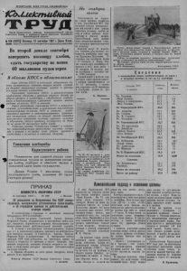 2, КОЛЛЕКТИВНЫЙ ТРУД 13 сентября 1957 года, № 109 Дать Родине 5 миллионов пудов хлеба, поднять 40 тыс. гектаров целины—долг тружеников района 10 сентября состоялся пленум районного комитета партии, который обсудил доклад секретаря РК КПСС С. Д. Чипиля «О завершении полевых работ и расчёте с государством по продуктам сельского хозяйства». На полях нашего района идет напряженная работа по завершению косовицы хлебов. Наиболее организованно провела жатву хлебов Октябрьская МТС. В зоне этой станции колхоз имени Джамбула закончил косовицу зерновых первым в районе и области— 25 августа. Вслед за ним завершили косовицу на всей площади колхозы имени ХХпартсъезда. «Заветы Ильича» этой же зоны, колхоз имени Куйбышева Чернокурьинской станции. На сегодняшний день осталось не скошено немногим более 9 тысяч гектаров, которые, несомненно, будут сжаты в ближайшие два-три дня. Вступая в уборку, мы имели расчеты управиться с косовицей за 18 рабочих дней. Однако в ряде хозяйстве этой задачей не справились по той причине, что плохо организовали работу жаток. Вот, например, по передовой Октябрьской МТС среднесуточная выработка на лафетную жатку в бригаде тов. Гергерта составляет 30,56 гектара. Здесь жатву закончили за 14 рабочих дней. А в тракторных бригадах тт. Вернера, Довгаль и Хмелевского выработка оказалась почти на половину меньше, и поэтому они не управились с уборкой в обусловленные сроки. А в Чернокурьинской МТС среднесуточная выработка на жатку не поднимается выше 10 гектаров. Например, за 7 сентября эта станция скосила 338 гектаров 15-ю жатками и 22-мя переоборудованными комбайнами, то есть средняя выработка на одну машину составила всего 8 гектаров. Столько же было сделано и 8 сентября. Ниже своих возможностей работает на уборке Карасук- ская МТС. Здесь также уборочная техника используется не на полную мощность. У нас на жатве хлебов еще (с IV пленума районного номитета партии) немало недостатков. Районная партийная организация преодолела прямое и косвенное сопротивление прогрессивному методу жатвы хлебов— -раздельной уборке, но в ряде случаев она проведена некачественно, на высоком срезе, и поэтому при подборке допускаются большие потери. Теперь основное внимание переносится с жатвы хлебов на подборку валков и обмолот, на борьбу с потерями зерна, на досрочное выполнение первой заповеди перед государством. Страна ждет от нас в этом году больше хлеба, чем мы сдали в прошлом году. Еще задолго до начала хлебоуборки мы выдвинули лозунг «Дадим Родине 4 миллиона пудов зерна». Прошедшие во второй половине лета дожди резко изменили виды на урожай. В ряде колхозов, таких как им. Андреева, им. М. Горького, им.Калинина, им.Жданова,«Новая семья», им. Сталина и многие другие получат в этом году урожай значительно выше прошлогоднего, а в остальных колхозах средний намолот составит не менее 7 центнеров с гектара. Поэтому мы имеем реальные воможности сдать нынче в закрома страны хлеба не 4 миллиона пудов, как намечали раньше, а значительно больше. Дать родине 5 миллионов пудов кулундинского хлеба— вот долг всех тружеников района, и на выполнение этого почетного долга всех работников села и города призвана поднять районная партийная организация. Однако на сегодняшний день положение с хлебозаготовками у нас обстоит плохо. Лучше других ведут хлебосдачу колхозы «Вперед