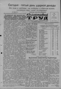 Сегодня—пятый день ударной декады Все силы и средства—на подборку и обмолот валков, усиленную сдачу хлеба государству! У К А З Президиума Верховного Совета СССР Об упорядочении дела присвоения имен государственных и общественных деятелей краям, областям, районам, а также городам и другим населенным пунктам, предприятиям, колхозам, учреждениям и организациям ПРОЛЕТАРИИ ВСЕХ СТРАН, СОЕДИНЯЙТЕСЬ! 1СЪи*1£& гш&ш й Президиум Верховного Совета СССР отмечает, что в деле присвоения административным центрам, предприятиям, колхозам, учреждениям, учебным заведениям имен советских государственных и общественных деятелей были допущены крупные недостатки и отступления от ленинских традиций. Великий Ленин учил советских людей быть скромными и сам былобразцом скромности и простоты, непримиримым противником возвеличения его имени. «Выне можете представить себе,—говорил он,— до какой степени неприятно мне постоянное выдвигание моей личности». При жизни В. И. Ленина имя его не присваивалось ни одной области, ни одному району или городу. Впервые имя Ленина было присвоено городам Ленинграду и Ульяновску после его смерти, в 1924 году, в знак огром ной любви советского народа к своему вождю и'учителю и в целях увековечения его памяти. В последующие годы по просьбам трудящихся в исключительных случаях некоторым городам, районам, поселкам предприятиям, колхозам, учреждениямбыли посмертно присвоены имена отдельных видных государственных и общественно-политических деятелей, что являлось одной из форм признания народом их выдающихся заслуг и выражения доверия трудящихся Коммунистической партии. Однако в период распространения культа личности имена государственных и общегим населенным пунктам, пред приятиям, железнодорожным станциям, колхозам, учреждениям, учебным заведениям и организациям имен го сударственных, общественно- политических деятелей, деятелей науки и культуры при их жизни. 2. Установить, что впредь присвоение имен в соответствии со статьей первой настоящего Указа может производиться только посмертно, в целях увековечения памяти особо выдающихся государственных, общественно- политических деятелей, защитников Родины, героев труда, деятелей науки и культуры и лишь в исключительных случаях по ходатайствам трудящихся, а также советских и общественных организаций в следующем порядке: а) краям, областям, районам, а также городам и другим населенным пунктам присвое ние имен производится Прези диумами Верховных Советов со юзных республик; б) государственным предприятиям, железнодорожным станциям, учреждениям и другим объектам и организациям общесоюзного подчинения присвоение имен производится Советом Министров СССР в) государственным предприятиям, учреждениям и другим объектам и организациям союзно-республиканского, республиканского и местного подчинения присвоение имен производится Советами Министров союзных республик; г) колхозам, предприятиям 1957 СЕНТЯБРЬ 15 Воскресенье № 110 (2298) Орган Карасукского райкома Коммунистической партии Советского Союза и районного Совета депутатов трудящихся Новосибирской области Цена 15 копеек. За сутки— 60 гектаров! ственных деятелей еще при их|и артелям промысловой коопежизни стали присваиваться большому количеству районов, городов, поселков, предприятий, колхозов, учебных заведени