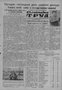 Сегодня-последний день ударной декады Усилить поток хлеба в государственные закрома! С 20 сентября поставить дойные гурты на стойловое содержание Постановление бюро Карасукского РК КПСС от 18 сентября 1957 года В целях выполнения решения бюро Новосибирского обкома КПСС от 13 сентября 1957 года «О постановке дойного скота на стойловое содержание в колхозах и совхозах области», бюро РК КПСС считает, что в колхозах и совхозах района в текущем году есть полная возможность поставить дойный скот на стойловое содержание с 20 сентября. За счет хорошего урожая кукурузы по состоянию на 15 сентября заложено силоса на каждую корову по 6,1 тонны, это больше, чем в прошлом году, на 3,6 тонны. Есть полная возможность обеспечить сытую зимовку грубыми кормами за счет заготовки сена, соломы хорошего качества из-под раздельной уборки, а также иметь фураж. Правильное кормление и уход обеспечат подготовку коров к отелу и повысят про дуктивность их. Бюро РК КПСС постановляет: 1. Обязать директоров МТС, совхозов, председателей колхозов, секретарей парторганизаций обеспечить постановку па стойловое содержание всех коров с 20 сентября. Считать основной задачей в животноводстве—обеспечить c l октября 1957 г. по 1 июня 1958 г., т. е. за зимне-стойловый период надои в среднем от каждой коровы в колхозах не менее 1.300 литров, в совхозах— 1.500 литров. 2. Потребовать от директоров совхозов, председателей колхозов, секретарей парторганизаций вместе со специалистами сельского хозяйства разработать для каждой молочно-то варной фермы режим дня и рационы кормления с учетом содержания на стойловом периоде до 1 июня 1958 года: а) провести по зонам МТС и совхозам до 25 сентября однодневные совещания заведующих МТФ, доярок, скотников- пастухов с вопросом: «О распорядке дня на фермах, рационах кормления коров, меро-, нриятиях по повышениюнадоев молока в зимне-стойловыйпериод и росте поголовья коров»: б) в пятидневный срок ’устранить имеющиеся недостатки в подготовке животноводческих помещений к зимне-стойловому содержанию животных. Развернуть строительство временных примитивных помещений для нормального размещения всего поголовья скота не позднее 15 октября с. г.; в) завершить все работы по механизации водоснабжения на животноводческих фермах. При недостатке воды поставить в коровниках чаны, бочки, колодцы, подвозить воду и поить коров только в помещениях. 3. Обязать правления колхозов, директоровМТСи совхозов обратить особое внимание на укомплектование животноводческих ферм за счет лучших людей. Разработать условия по дополнительной оплате труда. Шире развернуть социалистическое соревнование среди работников животноводства. Па каждой ферме оборудовать комнату отдыха и закрепить агитаторов. 4. Усилить заготовку сочных кормов, сена, организовать сбор соломы, сделать траншеи для известкования соломы. Вкаждом колхозе и совхозе заготовить на свиноматку не менее 7 тонн комбинированного силоса на территории свиноводческой фермы. 5. Учитывая, что свинопо- головье растет медленно, запретить правлениям колхозов и директорам совхозов продажу поросят. Весь молодняк, за исключением разовых свинок, поставить на откорм и сдавать государству не нитке 80—100 кг. живого веса каждой го. ловы. 6. Обязать секретарей первичных парторганизаций вовлечь всех колхозников, рабочих МТС и совхозов в акти