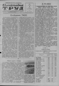 ПРОЛЕТАРИИ ВСЕХ СТРАН, СОЕДИНЯЙТЕСЬ! В РК КПСС lO K lU £ jcn U i£H SU l Орган Карасуксного райкома Коммунистической партии Советского Союза и районного Совета депутатов трудящихся Новосибирской области 1957 ОКТЯБРЬ О Среда № 121 (2309) Цена 15 копеек. Сообщение ТАСС В течение ряда лет в Советском Союзе ведутся научно-исследовательские и опытно-конструкторские работы по созданию искусственных спутников Земли. Как уже сообщалось в печати, первые пуски спутников в СССР были намечены к осуществлению в соответствии с программой научных исследований Международного геофизического года. V"C В результате большой напряженной работы научно-исследовательских институтов и конструкторских бюро создан первый в мире искусственный спутник Земли. 4 октября 1957 года в СССР произведен успешный запуск первого спутника. По предварительным данным, ракета-носитель сообщила спутнику необходимую орбитальную скорость около 8.000 метров в секунду. В настоящее время спутник описывает эллиптические траектории вокруг Земли и его полет можно наблюдать в лучах восходящего Ь и заходящего Солнца при помощи про- W стейших оптических инструментов (биноклей, подзорных труб и т. п.) Согласно расчетам, которые сейчас уточняются прямыми наблюдениями, спутник будет двигаться на высотах до 900 километров над поверхностью Земли; время одного полного оборота спутника будет 1 час 35 минут, угол наклона орбиты к плоскости экватора равен 65 градусов. Над районом города Москвы 5 октября 1957 года спутник прой- дет дважды—в 1 час 46 мин. ночи и в 6 час. 42 мин. утра по московскому времени. Сообщения о последующем движении первого искусственного спутника, запущенного в СССР 4 октября, будут передаваться регулярно широковещательными радиостанциями. Спутник имеет форму шара диаметром 58 см и весом 83,6 кг. На нем уста- • новлены два радиопередатчика, непрерывно излучающие радиосигналы с частотой 20,005 и 40,002 мегагерц (длина волны около 15 и 7,5 метра соответственно). Мощности передатчиков обеспечивают уверенный прием радиосигналов широким кругом радиолюбителей. Сигналы имеют вид телеграфных посылок длительностью около 0,3 сек., с паузой такой же длительности. Посылка сигнала одной частоты производится во время паузы сигнала другой частоты. Научные станции, расположенные в различных точках Советского Союза, ведут наблюдение за спутником и определяют элементы его траектории. Так как плотность разреженных верхних слоев атмосферы достоверно неизвестна, в настоящее время нет данных для точного определения времени существования спутника и места его вхождения в плотные слои атмосферы. Расчеты показали, что вследствие огромной скорости спутника в конце своего существования он сгорит при достижении плотных слоев атмосферы на высоте нескольких десятков километров. В России еще в конце 19 века трудами выдающегося ученого К. Э. Циолковского была впервые научно обоснована возможность осуществления космических полетов при помощи ракет. Успешным запуском первого созданного человеком спутника Земли вносится крупнейший вклад в сокровищницу мировой науки и культуры. Научный эксперимент, осуществляемый на такой большой высоте, имеет громадное значение для познания свойств космического пространства и изучения Земли как планеты нашей солнечной системы. В течение Международного геофизического года Советск