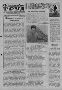 ПРОЛЕТАРИИ ВСЕХ СТРАН, СОЕДИНЯЙТЕСЬ! 1CbUj£Jcrnu£Hsui г Орган Карасукского райкома Коммунистической партии Советского Союза и районного Совета депутатов трудящихся Новосибирской области Накануне великого праздника г=п II №132 (2319) Воскресенье, 3 ноября1957 г-1 Цена15кпо. f r ™ я г о в mm я я я X I I I ! 1 « ! I I И I 1 И I ! I I ! 1| I I I II I I I 5 I I Считанные дни остались до великого, радостного дня, когда вся наша страна, все прогрессивное человечество будет торжественно отмечать славное 40-летие первого в мире социалистического государства. Уже сейчас повсюду чувствуется приближение этого великого праздника. Готовясь к этой знаменательной дате, каж дый советский человек еще и еще раз спрашивает себя, все ли возможное он сделал, чтобы достойно встретить славный юбилей Октября. Радио, газеты каждый день называют все новые и новые имена тех, кто самоотверженным трудом вносят свой достойный вклад в дело коммунистического строительства. Наталья Сизикова и Мария Заводская из райпищекомбината, Екатерина Степаненко и Нина Павлова с завода стройматериалов, киномеханики Петр Дудко, Павел Бригида и Николай Гончаров и многие, многие д р у ги е - это те, кто работают, опережая время, в счет 1958 года. Встречая праздник, преображается город, одеваются улицы в праздничный наряд, приводятся в порядок территории предприятий, учреждений, сами здания. Празднично выглядит контора завода стройматериалов. Хорошо оформлены здания пищекомбината, райпотребсоюза, больницы, автороты № 11 и некоторых других. Здесь вывешены флаги, лозунги, плакаты, портреты руководителей Коммунистической партии и Советского правительства. Однако многие административные и партийные руководители все еще чего-то выжидают. Не приступили к оформлению общественных зданий строители новой железной дороги, руководители совхоза им, Дзержинского, СМУ «Загот- зерно», железнодорожной станции Карасук и некоторые другие. Территории некоторых учреждений захламлены, куча мусора лежит даже под окнами райисполкома. Горсовет недостаточно проводит работы среди индивидуальных домовладельцев и потому многие жители города мало заботятся о том, чтобы к празднику их дом, двор выглядели чистыми, уютными, праздничными. До праздника осталось 4 дня. Еще есть время привести наш город в праздничный вид. Руководителям учреждений, предприятий, горсовету, всем жителям в эти дни необходимо привести в порядок, все дворы, усадьбы, украсить здания флагами, лозунгами, плакатами. Каждый владелец своей квартиры должен считать своим долгом, приветствуя Великий праздник Октября, вывесить флаг. Оденем все улицы города в праздничный наряд! ОТ КОМИССИИ.ПО ПРОВЕДЕНИЮ ПРАЗДНОВАНИЯ 40-ЛЕТИЯ ОКТЯБРЯ В Г. КАРАСУКЕ Плнадесяти месяцев перевыполнен Трудовыми успехами встречает праздник Октября кол лектив работников райпром- комбината. Десятимесячный план по валовой продукции перевыполнен. Рабочие пилорамы (нач, т. Плотников) ноября выполнили годо- плзн на 112 процентов. С трудовым напряжением к 1 вон Торжественное заседание исполкомов городского и районного Советов депутатов трудящихся совместно с партийными, комсомольскими и профсоюзными организациями города состоится 6 ноября 195т года в 8 часов вечера в помещении районного Дома культуры. После торжественной части—концерт художественной самодеятельности. Вход по пригласительным билетам. 7 но