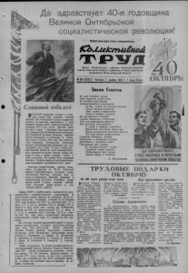 Славный юбилей ВЕЛИКИЙ праздник сегодня у советских людей. Они отмечают славный юбилей—40-летиепервоговмиресоциалистического государства, завоеванного в боях Великой Октябрьской социалистической революции 1917 года, когда рабочий класс России в союзе с трудовым крестьянством под руководством Коммунистической партии, возглавляемой великим Лениным, свергнул власть буржуазии и помещиков и установил власть Советов. Весь мир был потрясен этим событием. Октябрьская революция явилась вдохновляющим примреомдля пролетариата всего мира. В ходе и после второй мировой войны на путь социалистического развития вступили многие страны Европы и Азии и сейчас успешно строят у себя социализм. Вот почему 40-я годовщина Великого Октября является интернациональнымпраздником трудящихся всего мира. Поистине величественны победы Советского государства за 40 лет Советской власти. Советский народ, построив социалистическое общество, уверенно идет по пути к коммунизму. Высоким трудовым и политическим подъемом встречают трудясь; щиеся нашей Родины славный юбилей. Свйо скромный вклад вносят и труженики нашего района. Райком КПСС и райисполком, подведя итоги предоктябрьского социалистического соревнования, за достигнутые успехи занесли на районную Доску почета: колхоз им. Тельмана, который за 10 месяцев 1957 года произвел на 100 га сельхозугодий 7,6 ц. мяса, в т. ч. 2,4 ц. свинины, 72,2 ц. молока, 89,5 ц. шерсти и 1335 штук яиц; колхоз им. Куйбышева, давший на 100 га сельхозугодий 9,7 ц. мяса, в т. ч. 2,1 ц. свивины, 62,4 ц. молока, 125,9 ц. шерсти, 843 шт. яиц; завод строительных материалов, выполнивший годовой план к 1 ноября на 89,3 процента. Мы сегодня горячий праздничный привет и праздничные поздравления посылаем передовым дояркам ime Ена, Анне Морозовой. Лидии Козловой, Татьяне Ульман, Матрене Пересунько, Елизавете Бухмиллер, Анне Москаленко; передовикам производства Е. Степаненко, А. Герман, В. Нестеровой, Н. Павловой, В. Соловьевой, П. Азарову, И. Каушан, И. Луцко, Н. Сизиковой, Н. Завацкой, Д. Азарову, Э. Глок. Славно потрудился на уборке урожая комсомольско-молодежный агрегат Дмитрия Токарьиз Карасук- ской МТС. Двумя комбайнами он ежедневно подбирал валки с 70—80 гектаров. Приведя машины на усадьбу МТС после уборки, он дал слово отремонтировать оба комбайна ко дню 40-й годовщины Октября. 4 ноября оба комбайна были поставлены на линейку готовности. ТРУДОВЫЕ ПОДАРКИ ОКТЯБРЮ На 200 тысяч рублей сверх плана План перевыполнен в два раза Высокими производственными показателями встречает 40-ю годовщину Октября инициатор предоктябрьского соревнования коллектив завода строительных материалов. План десяти месяцев по валовой продукции гыполнен на 110 процентов, выдано сверхплановой продукции на 212 тысяч рублей. Хорошо справился завод с выпуском основной продукции—кирпича: по обжигу десятимесячная программа выполнена на 151 процент, выдано сверх плана свыше миллиона штук кирпича. Себестоимость продукции по сравнению с прошлым годом снижена на 16 проц. Особенно хороших производственных успехов добились в предоктябрьском соревновании штамповщик В.Вильмс, слесарь-наладчик П. Шнайдер, заваль- щица А. Терехова, швея 3. Булгакова, шофер В. Вовк, плотник А. Констанц и многие другие. А. Рогозный. Вчера на своем торжественном собрании коллектив мясокомбината подвел итоги предоктябрьского социалистичес