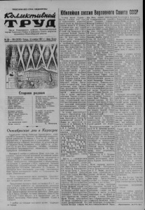 13 ноября 1957 года, № 135 КОЛЛЕКТИВНЫЙ ТРУД 3 К НАРОДАМ СОВЕТСКОГО СОЮЗА Обращение Верховного Совета Союза Советских Социалистических Республик Дорогие товарищи и друзья, граждане Советского Союза! Верховный Совет Союза Советских Социалистических Республик горячо приветствует и сердечно поздравляет вас со всенародным праздником славного сорокалетия Великой Октябрьской социалистической революции. 40 лет назад рабочие и крестьяне нашей страны под руководством Коммунистической партии, во главе с Владимиром Ильичей Лениным низвергли ненавистный буржуазно-помещичий строй, взяли в свои руки политическую власть, создали первое и мире подлинно народное социалистическое государство. Великая Октябрьская революция вывела трудящихся на широкую дорогу победоносного социалистического строительства, пробудила их могучие творческие силы. Светлая мечта человечества о социализме впервые в истории претворилась в жизнь. Октябрьская социалистическая революция, построение социализма в ССС,Р победа в Великой Отечественной войне—это немеркнущие подвиги советского народа, имеющие всемирно-историческое значение. Созданное героическим трудом советского народа социалистическое общество с честыо выдержало историческую проверку и доказало свое превосходство перед капитализмом. Его не смогли поколебать никакие бури и грозы, никакие происки внешних и внутренних врагов. В кратчайший исторический срок некогда отсталая Россия на основе советского строя превратилась в великую индустриально-колхозную державу. Взгляните на карту Советского Союза, как неузнаваемо изменилось лицо нашей Родины. За годы Советской власти страна покрылась густой сетью заводов, фабрик, электростанций, железнодорожных и автомобильных магистралей, шахт и рудников, колхозов, МТС и совхозов. В дремучей сибирской тайге, знойных песках Средней Азии, в Заполярной тундре, в горных долинах Кавказа возникли крупные промышленные центры и новые города. На Волге и Днепре, на могучих реках Сибири воздвигнуты и строятся крупнейшие электростанции. В безлюдных ковыльных степях Казахстана и Алтая заколосились тучные пшеничные нивы. Невиданно расцвела новая, социа- диетическая культура народов Советского Союза, их искусство и литература. Широко и успешно развивается народное образование. Достойным детищем социализма является передовая советская наука. Наши ученые, овладев секретами получения атомной энергии, обогнали в ряде областей науки капиталистические страны. Советский Союзпервым создал межконтинентальную баллистическую ракету, осуществил дерзновенную мечту человечества— запуск первых в мире искусственных спутников Земли и тем внес новый величайший вклад в сокровищницу мировой науки. Можно быть уверенными в том, что советские ученые еще не раз прославят Родину новыми замечательными открытиями и изобретениями. В результате победы социализма позникло и укрепилось морально-политическое единство советского общества, упрочился союз рабочего класса и колхозного крестьянства—незыблемая основа советского строя. Русские, украинцы и белорусы, узбеки, казахи и грузины, азербайджанцы, литовцы и молдаване, латыши, киргизы и таджики, армяне, туркмены, эстонцы, народы автономных республик и областей и все другие народы нашей страны, воспитанные в духе дружбы и социа