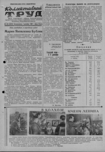 ч ПРОЛЕТАРИИ ВСЕХ СТРАН, СОЕДИНЯЙТЕСЬ) 1СЫЛО£!спги£нш 'I 'p va Орган Карасукского райкома Коммунистической партии Советского Союза и районного Совета депутатов трудящихся Новосибирской области №144 (2331)| Воскресенье, 1декабря 1957 | Цена 15коп. Наш кандидат в народные судьи Мария Яковлевна Бублик Подлинно демократический Советский суд служит интересам социалистического государства. Он нераздельно связан с народом и осуществляет его волю, выраженную в законах. Советский суд коренным образом отличается от любого буржуазного суда, являющегося орудием классового господства буржуазии. Советский суд призван защищать от всяких посягательств общественное и государственное устройство, установленное Конституцией СССР, социалистическую систему хозяйства и социалистическую собственность, нрава и интересы граждан, гарантированные законом. «У меня нет сомнения,— говорил М. И. Калинин,— что и сейчас и в ближайшее будущее роль суда будет расти, будет расти роль суда как агитатора-пропагандиста, борца за директивы партии и правительства, за социалистическую законность, за государственную дисциплину». Юридический работник — слуга народа, который призван защищать незыблемые права и интересы советских граж- • ш. Около 4 лет на почетном посту юридического работни- i с честью трудится Мария Яковлевна Бублик. Родилась Мария Яковлевна 12 августа 1927 года в селе Ужаниха, Чулымского района, Новосибирской области в семье крестьянина, русская, член КПСС с 1955 года. С 1935 года по 1945 год училась в Ужанихинской средней школе, по окончании школы работала в Ужанпхинском детском доме в должности воспитателя, за это время окончила заочно педучилище. В 1951 году поступила в юридическую школу города Новосибирска, которую окончила в 1953 году. г После окончания юридической школы работает народным судьей Кочковского района Новосибирской области. Бублик Мария Яковлевна в работе инициативна, принимает активное участие в общественной жизни района. Была избрана депутатом Кочковского райсовета, пользуется среди избирателей хорошим авторитетом. Колхозники сельхозартели «Маяк Ильича», рабочие, инженерно-технические работники и служащие Карасукского молочноконсервного комбината, завода стройматериалов и Карасукской машинно-тракторной станции на предвыборных собраниях выдвинули М. Я. Бублик своим кандидатом в народные судьи но Карасукскому избирательному округу. Товарищ Бублик— достойный кандидат в народные судьи. Она человек авторитетный, обладает юридическим образованием, безупречна в поведении, честно трудится на благо Родины во имя коммунизма. Она имеет моральное право судить других от имени народа. Товарищи избиратели! В день выборов отдадим свои голоса за кандидата в народные судьи тов. Бублик Марию Яковлевну. Агитаторы вышли на десятидворки Повышенное обязательство Выполняя решения Коммунистической партии и Советского правительства — в ближайшие два-три года догнать СШ А по производству продуктов животноводства на д уш у населения, коллектив совхоза им. Дзержинского 26 ноября досрочно выполнил годовой план сдачи молока.' Государству сдано 24.490 центнеров молока. Труженики совхоза, единодушно одобряя и поддерживая Декларацию Совещания представителей коммунистических и рабочих партий социалистического лагеря и Манифест мира, взяли повышенное обяз