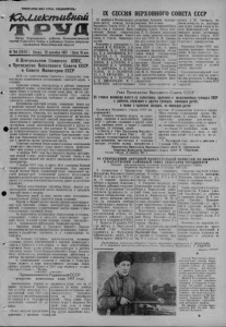 ПРОЛЕТАРИИ ВСЕХ СТРАН, СОЕДИНЯЙТЕСЬ) 1СЫАае1сти& ш й Д Орган Карасукского райкома Коммунистической партии Советского Союза и районного Совета депутатов грудящихся Новосибирской области №154 (2341) 1 Среда, 25 декабря 1957 |Цена 15коп. В Центральном Комитете КПСС, в Президиуме Верховного Совета СССР, в Совете Министров СССР 40-й год существования Советского государства ознаменовался выдающимися достижениями советской науки и техники. Советские учёные, конструкторы и рабочие совершили величайший подвиг, осуществив запуск искусственных спутников Земли и показав тем самым всему миру, на что способен творческий гений и созидательный труд народа социалистического общества, свободного от оков капиталистического угнетения. Достижения советских учёных, открывших новую эру в развитии мировой науки, являются вполне закономерными, подготовленными всем предшествующим развитием социалистического общества, его экономики и культуры, науки и техники. Эти достижения основываются на высоком уровне развития советской тяжёлой индустрии, точного машиностроения и приборостроения, радиоэлектроники, электротехники, химии, качественной металлургии и других отраслей промышленности. Они вытекают из самого характера социалистического строя, базирующегося на строго научных основах и создающего наиболее благоприятные условия для образования всего населения, роста научных кадров и развития научно-технической мысли. Советские спутники Земли являются живым воплощением п га и ск о го многолетнего труда нашего народа, превратившего свою родину в могучую индустриальную державу. 4 октября 1957 года был запущен в мировое пространство первый в мире искусственный спутник Земли и тем самым сделан первый шаг на пути завоевания космического пространства. 3 ноября 1957 года, в канун 40-й годовщины Великой Октябрьской социалистической революции, был запущен второй епутвик Земли, оснащенный более совершенной научной аппаратурой, позволивший провести исследования явлений в космическом пространстве и поведения живых существ яупловиях межпланетных полетов, ранее недоступных для науки. Запуск искусственных спутников Земли явился осуществлением дерзновенной мечты человечества и триумфом мировой науки и техники. Миллионы людей во всех частях света восторженно приветствовали победу советской науки техники . Партия и Правительство высоко оценили самоотверженный труд советских ученых, конструкторов, инженеров и рабочих, создавших и осуществивших запуск первых в мире искусственных спутников Земли. За выдающиеся достижения в области науки и техники, позволившие создать и запустить искусственные спутники Земли, большой группе ведущих ученых, конструкторов и специалистов присуждены Ленинские премии. Орденами Левина и Трудового Красного Знамени награждены научно-исследовательские организации, участвовавшие в разработке спутников и в осуществлении их з апусков. За создание спутников, ракеты-носителя, наземных пусковых средств, измерительной и научной аппаратуры л запуск в Советском Союзе первых в мире искусственных спутников Земли i руине ученых, конструкторов и рабочих присвоено звание Героя Социалистического Труда. Большое число специалистов, инженерно-технических работников и рабочих награждено орденами и медалями Советского Союза. В ознаменование