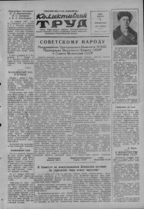 Новогодние послания К. Е. Ворошилова, Н. С. Хрущева и Н. А. Булганина 31 декабря 1957 года К. Е. Ворошилов, Н. С. Хрущев и Н. А. Булганин направили Главам ин щтраввых государств и Главам правительств дружественные новогодние послания, в которых выразили надежду, что наступающий год станет годом укрепления дружбы и мира между народами на основе при ципа мирного сосуществования с тем, чтобы люди везде могли жить и трудиться спокойно, не испытывая страха за свое будущее, за судьбу своих детей, своих близких. В своих посланиях К. Е. Ворошилов Н С. Хрущев и Н. А. Булганин пожелали народам счастья и успехов в достижении этой благородной цели. (ТАССГ МОЛОДЕЖНЫЙ БАЛ В КРЕМЛЕ ) Вечером 1 января в Большом Кремтевском дворце соб-| рались молодые производст-1 яенники, ученые, студенты,1 литератор! , комсомольские, активисты, представители за -; рубежной молодежи. В Георгиевском зале моло-j дежь приветствовал и горячо поздравил с Новым годом сек - ' ретарь МГЯ ВЛКСМ С. Павлов.! Театрализованное представление напом шло юношам и девушкам о славном пути комсомола, его боевых и трудо вых делах. Заслуги комсомола перед Родиной отмечены пятью орденами. В зале реяли знамена с изображением этих высоких ваград, звучали слова о безграничной верности Ленипскоп' комсомола Коммунистической партии, Родине, народу. Под сводами зала звучали песни советской молодёжи о покорении целины, о вдохновенном труде и счастье. В конце бала были показаны танцы Шестого всемирного фестиваля. Их исполняли лауреаты художественных конкурсов на московском празд нике юности. До поздней ночи продолжался бал московской молодежи. КРЕМЛЁВСКАЯ ЁЛКА Это ста то чудесной традицией: утром первого января в Кремль приходят дети. Здесь, словно подавая сигнал к открытию большого, всесоюзного новогоднего детского праздника, зажигается самая высокая и нарядная елка —«главная елка Советского Союза», как назыгают ее ребята. Вот и 1 января 1958 года седой Московский Кремль радушно встречал своих юных гостей. Этим утром все было необычайно в Георгиевском зале. Все здесь—настоящее чудо, волшебство. И елка тоже зажглась не просто, не как-нибудь, а самым чудесным и необыкновенным образом: по велению Деда Мороза она загорелась от света, который послал ей из дальней дали наш советский спутник! ПРОЛЕТАРИИ ВСЕХ C l РАН, СОЕДИНЯЙТЕСЬ! 4CoUU£Jcnui#imu Орган Кара' укского райкома Коммунистической партии Советскою Союза и районного Совета депутатов трудящихся Новосибирской области 1 0 5 8 ЯНВАРЬ 5 Воскресенье № 2 ( 2 8 4 5 ) Цена 15 юпеек. С О В Е Т С К ОМ У Н А Р О Д У Поздравление Центрального Комитета Ki ICC, Президиума Верховного Совета СССР и Совета Министров СССР Дорогие товарищи, друзья, граждане нашей великой социалистической Родины! Центральный Комитет Коммунистической партии Советского Союза, Президиум Верховного Совета С С С Р и Совет Министров С С С Р горячо поздравляют героический Советский народ, всех рабочих и работниц, колхозников и колхозниц, интеллигенцию нашей страны, воинов славной Советской Армии и Флота, нашу замечательную молодежь с наступающим Новым годом! Подходит к концу 1957 год. Это был хороший год—добрым словом провожают его все советские люди. Наш народ под руководством Коммунистической партии добился в атом году новых, замечательных успехов в строительстве коммунизма. На новом большом подъеме находится соц
