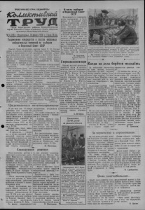 2 КОЛЛЕКТИВНЫЙ ТРУД 18 января 1958 года, № 8 Третий пленум райкома КПСС 17 января состоялся 111 пленум Карасукского райкома партии, который обсудил два вопроса: «Решение декабрьского пленума ЦК КПСС «О работе профессиональных союзов СССР» по докладу секретаря райкома партии Н. Заского и «О состоянии работы с сельскохозяйственными кадрами в районе» по докладу секретаря райкома партии Я. Бабицкого. Докладчик по первому вопросу изложил содержание постановления декабрьского пленума ЦК КПСС «О работе профессиональных союзов СССР», значительно р а сш и р и вш е го права профсоюзов в решении хозяйственных и политических вопросов, и подверг анализу работу профсоюзных организаций в нашем районе. Резкой критике докладчик подверг серьезные недостатки в работе профсоюзной организации Барасукской автороты «Союзеовхозтраноа» (председатель т. Киселев, секретарь парторганизации т. Милейко). Собрания-здесь не проводятся, вопросы производства, состояния трудовой дисциплины на рабочих собраниях не обсуждаются. Начальник автобазы т. Злобин не опирается на профсоюзную организацию в решении вопросов руководства хозяйством. Принижена роль профсоюзной организации при решении хозяйственных вопросов в отделе временной эксплуатации. К советам рабочих здесь не прислушиваются, социалистическое соревнование в коллективе не организовано, трудовая дисциплина низка. Здесь имеют место случаи невыхода на работу, из-за чего иногда срывается отправка поездов. Много недостатков в работе профорганизации завода стройматериалов (председатель тов. Исаев). За весь 1957 год здесь проведено 3 профсоюзных собрания: одно по поводу вручения переходящего красного знамени заводу, второе— по выдвижению кандидатов в состав народных заседателей и третье— отчетно-выборное. Таким образом, на заводе стройматериалов рабочие были отстранены от непосредственного контрола за деятельностью администрации, от участия в управлении предприятием. Подобные факты имеют место и в других ваших организациях. Вследствие ослабления внимания партийных организаций и руководителей предприятий к профсоюзам их роль припвжева. Важным средством вовлечения рабочих в управление предприятием является организация социалистического соревнования. Но еще на многих предприятиях собрания проводятся чисто формально, итоги выполнения взятых обязательств подводятся и сообщаются рабочим нерегулярно. Это наблюдается в промкомбинате, СМП-233, отделе временной эксплуатации, в совхозе имени Дзержинского. Ксть чему поучиться в организации соревнования на комбинате по производству молочных консервов и сушке овощей. Здесь регулярно подводятся итоги соревнования,обсуждаются на собравиях рабочих, освещаются в стенных газетах ,заносятся на доску показателей. Передовики соцсоревнования поощряются премиями, награждаются почетными грамотами, приказами объявляются благодарности. Профсоюзные организации района мало проявляют заботы о создании лучших условий для работы на предприятиях, о контроле за созданием техники безопасности на производстве. в снабжении рабочих спецодеждой. Несколько раз обещал директор «Заготзерно» т. Лысенко открыть душевую. Однако она не открыта до сих пор, а профсоюзная оргавиза- ния не настояла на открытии душевой. Вот уже месяц обещает директор совхоза имени Дзержин