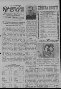 2 КОЛЛЕКТИВНЫЙ ТРУД 24 января 1958 года, № 10 Совещания передовиков сельского хозяйства Белоруссии и Украины рАБОТНИНИ НУЛЬТПРОСВЕТУЧРЕЖДЕНИЙ ОТЧИТЫВАЮТСЯ ПЕРЕД НАСЕЛЕНИЕМ - —. ■ — чг-----------------------------------------------------------------------— Комментарии к двум докладам... В Минске 21 января открылось совещание передовиков сельского хозяйства Белоруссии. Бурной продолжительной овацией встретили собравшиеся появление в президиуме Первого Секретаря ЦК КПСС товарища Н. С. Хрущева, члена Президиума и секретаря ЦК КПСС товарища Н. Г. Игнатова, передовиков сельского хозяйства республики, а также прибывших на совещание представителей братских республик — РСФСР, Украины, Латвии, Литвы. С докладом об итогах сельскохозяйственных работ в 1957 году и о социалистическом соревновании за увеличение производства сельскохозяйственных продуктов в 1958 году выступил первый секретарь ЦК КПБ тов. К. Т. Мазуров. По докладу тов. К. Т. Мазурова начались прения. Все выступления были проникнуты стремлением отметить славными трудовыми делами на Обращение ЦК КПСС и Совета Министров СССР. На совещании выступили представители братских республик— Литвы,Латвии, РСФСР, Украины. С большой речью на совещании выступил тепло встреченный собравшимися Первый Секретарь Центрального Комитета Коммунистической партии Советского Союза тов. Н. С. Хрущев. Участники совещания единодушно приняли обращение ко всем труженикам сельского хозяйства Белоруссии и решили продолжить соревнование с Литовской ССР. Под бурные аплодисменты принято приветственное письмо Центральному Комитету Коммунистической партии Советского Союза. * * * 21 января в Киеве, в сессионном зале Верховного Совета Украинской ССР открылось совещание передовиков сельского хозяйства Украины. С докладом об итогах истекшего сельскохозяйственного года и развертывании социалистического соревнования за дальнейшее увеличение производства и снижение себе тои- мости продукции сельского хозяйства в нынешнем году выступил председатель Совета Министров УССР Н. Т. Каль- ченко. По докладу развернулись оживленные прения. В работе совещания принимают участие первый секретарь ЦК КП Украины Н. В. Подгорный, председатель Президиума Верховного Совета УССР Д. С. Коротченко и другие руководители Коммунистической партии и правительства Украины. Поделиться опытом своей работы на совещание сельского хозяйства Украины прибыли также делегации Российской Федерации Белоруссии и Молдавии. В своих выступлениях ораторы, подробно рассказывая о достижениях тружеников социалистических полей Украины по дальнейшему развитию всех отраслей сельского хозяйства, обращали внимание на еще не решенные вопросы в повышении культуры земледелия, дальнейшем росте урожайности всех культур, подъеме животноводства. Совещание направило приветствие участникам совещания передовиков сельского хозяйства Белорусской ССР. Бурными аплодисментами встретили участники Украинского совещания ответ белорусских друзей. С огромным подъемом участники совещания приняли обязательства от имени всех колхозников и колхозниц, работников МТС и совхозов, специалистов, всех работников сельского хозяйства Украинской ССР на 1958 год. (ТАСС). Афиша на фанере с фоном синеватого цвета написана не позже, как весной. Ее не раз омывали дожди, просушивали знойные ветры, а потом осенн