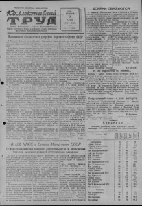 ПРОЛЕТАРИИ ВСЕХ СТРАН. СОЕДИНЯЙТЕСЬ! Орган Карат укскога райкома Коммунистической пар1ии Советскою Союза и районного Совета депутатов трудящихся Новосибирской области 1»о8 ФЕВРАЛЬ 5 Среда № 16 (2359) Цена 15 копеек Выдвиженке кандидатов вдепутаты Верховного Совета СССР В Москве 1 февраля началось выдвижение кандидатов в депутаты Верховного Совета СССР. Алые флаги, лозунги и транспаранты украсили один из цехов завода «Серн и молот». Сюда на предвыборное собрание пришли тысячи сталеваров, прокатчиков, рабочих других профессий, инженеров, техников и служащих. —У нас сегодня радостный день,— сказал старший мастер стана «750» II. И. Туртанов,— Мы собрались, чтобы назвать своего кандидата в депутаты Верховного Совета СССР. Я предла! аю выдвинуть от имени многотысячного коллектива металлургов завода «Серп и молот» кандидатом в депутаты Первого Секретаря ЦК КПСС Н. С. Хрущева. Предложение горячо поддер - жали сталевар П. Забегаев, весовщица копрово-шихтового цеха М. Романова, вальцов щик С. Касаткин, секретарь парткома завода В, Ломоносов. Участники собрания единогласно постановили выдвинуть Никиту Сергеевича Х р у щева кандидатом в депутаты Совета Союза Верховного Совета СССР по Калининскому избирательному округу. Кандидатура Н. С. Хрущева была видвинута также на заводах «Фрезер», «Прожектор», «Борец», в Пресненском машиностроительном заводе. В Краснопресненском избирательном округе на общем собрании коллектива вагоноремонтного завода «Памяти революции 1905 года» кандидатом в депутаты Совета Союза Верховного Совета СССР выдвинут Председатель Президиума Верховного Совета СССР, член Президиума ЦК КПСС Климент Ефремович Ворошилов. На собрании коллектива комбината твердых сцлавов по предложению мастера А. П. Чгрнозубова, секретаря цеховой кЬмсомодьской „организации Б. Комарова, лаборантки В. П. Коршуновой и других выдвинуть кандидатом в депутаты Верховного Сокета СССР по Дзержинскому избирательному округу заместитель председателя Совета Министров СССР, член Президиума ЦК КПСС Анастас Иванович Микоян. Предвыборное собрание состоялось в Московском Институте инженеров железнодорожного транспорта. По предложению доцента А. П. Третьякова кандидатом в депутаты Совета Союза Верховного Совета СССР но Дзержинско му избирательному округу выдвинут старший машинист депо Москва-сортировочная Виктор. Григорьевич Блаженов. Свыше двух тысяч человек собралось на предвыборное собрание завода «’Москабель». От имени коллектива предприятия электромонтер Г. И. Каратаев предложил выдвинуть кандидатом в депутаты Совета Национальностей но М о сковско му городскому избирательному округу Шверника Н и ко лая Михайловича. Кандидатура Н. М. Шверника была выдвинута также на ряде предприятий Дзержинского и Краснопресненского районов столицы. Предвыборные собрания, посвященные выдвижению кандидатов в депутаты Верховно го Совета СССР, начались в Ленинграде. На собрании многотысячного коллектива четырежды орден0 ионного Кировского завода Токарь-новатор И. Д. Рудаков предложил выдвинуть кандидатом в депутаты Совета Союза Верховного Совета СССР Председателя Президиума Верховного Совета СССР Климента Ефремовича Ворошилова. Кандидатуру К. Е. Ворошилова поддержали в своих выступ левиях ипженер-металлур! А. И. Канавина, молодой рабочий механическ