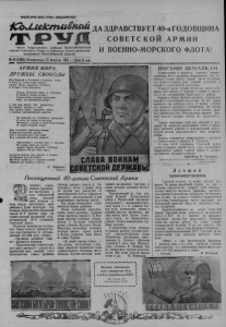 ПРОЛЕТАРИИ ВСЕХ СТРАН, СОЕДИНЯЙТЕСЬ! 1СЬииекпш£нш ирган Карагукекого райкома Коммунистической napi ии Советскою Союза и районного Совета депутатов трудящихся Новосибирской области ДА ЗДРАВСТВУЕТ 40-я ГОДОВЩИНА С О В Е Т С К О Й А Р М И И И ВОЕННО-МОРСКОГО ФЛОТА! №24(2366)||Воскресенье 23 февраля 1958 г.| Цена15коп. АРМИЯ МИРА, ДРУЖБЫ, СВОБОДЫ Под Нарвой и Псковом в далёкие годы В боях за Советскую власть Армия Мира, Дружбы, Свободы В вихрях атак родилась. Сиваш, Перекоп, Орёл и Каховка В памяти снова встают: Герои-отцы, сжимая винтовки, Идут на последний редут. С тех пор много лет пролетело, Но помнят народы о том, Как Армия наша, сражаясь умело, С любым расправлялась врагом. Её никогда не страшили преграды. В огне, на земле и на льду Насмерть,стояла у стен Сталинграда В сорок втором году! Она отстояла советское «нами, Поднятое сильной рукой... Оно и сегодня реет над нами Нод солнцем Отчизны родной. Закончены с честью бои и походы, И славы века не сотрут... Армия Мира, Дружбы, Свободы Хранит 40 лет наш труд. Солдаты запаса мы строим л пашем, И боремся против войны. Но если тревога,—с Армией нашей Пвйдем на защиту страны. И. Набатов. г. Карасук. П И С Ь М О З ЕМ Л Я К АМ Торжественно и радостно отмечают военнослужащие 40-ю годовщину Вооруженных Сил Советского Союза. Воины нашей части встречают ату знаменательную дату новыми успехами в боевой и политической подготовке. В нашей части служат несколько ваших земляков, работавших до призыва в армию в колхозах и на предприятиях Карасукского района. Ефрейтор Навел Дыбцев является отличником боевой и политической подготовки. Не без труда пришлось ему добиться этого. В начале службы все казалось трудным и незнакомым. На помощь ему пришли старослужащие, и он отлично овладел специальностью. Комсомольцы оказали Дыб цеву большое доверие, избрав его группкомсор- гом. Хорошо выполняв? свой долг рядовой А. Кондаков. Он является передовиком учебы и принимает активное участие в комсомольской работе, будучи членом комсомольского бюро подразделения. Хорошо отзывается командование о сержанте А. Толстокорово и рядовом В. Турханове. В день 40-й годовщины Советской Армии военнослужащие нашей части шлют трудящимся Карасукского района горячий привет и желают им больших трудовых успехов. Ефрейтор Н. Паньков, секретарь комсомольской организации Н-ского подразделения. Защита отечества есть священный долг намдого гражданина СССР, Из статьи 133 Конституции СССР. производственник Григорий Анульев до армии работал шофером. Во время армейской службы он еще в большем совершенстве овладел этой специальностью, искусно научился управлять автомобилем,закалился физически, повзрослел. За безупречную службу, за успехи в боевой и политической подготовке командование части наградило его Похвальной грамотой. Имел он несколько идругих поощрений. Демобилизовавшись из рядов Советской Армии, Григорий снова попросился на прежнюю работу в МТС. Но в наличии не оказалось свободных машин. Ему предложили временно пойти на другую работу. Он решил освоить специальность кузнеца. И это ему удалось. Перенимая опыт своего отца ПрокофияИвановича— лучшего производственника МТС, Григорий за короткое время стал неплохим мастером своего дела. Сейчас, в дни предвыборной кампании. Г. Анульев, как и его отец, трудится особенно добросовестно. Его ежедневная вырабо