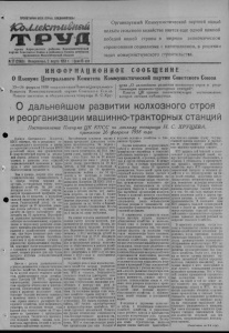 2 КОЛЛЕКТИВНЫЙ ТРУД 2 марта 1958 гожа, № 27 О дальнейшем развитии колхозного строя и' реорганизации машинно-тракторных станций Постановление Пленума ЦК КПСС по докладу товарища Н. С. ХРУЩЕВА, принятое 26 февраля 1958 года (Окончание). Пленум ЦК КПСС считает, что в интересах дальнейшего подъема социалистического сельского хозяйства страны, развития колхозного строя целесообразно изменить существующий порядок производственно-технического обслуживания колхозов и постепенно реорганизовать машинно - тракторные станции, которые, сыграв большую положительную роль, уже во многом исчерпали свои основные функции. Теперь, когда большинство колхозов в состоянии приобретать и правильно, более производительно использовать тракторы, комбайны и другие сельскохозяйственные машины, целесообразно перейти к продаже этих машин непосредственно колхозам. Это позволит значительно лучше использовать современную технику, ускорить технический прогресс в сельском хозяйстве, повысить производительность труда, увеличить производство валовой и товарной продукции в расчете на сто гектаров земельных угодий и снизить ее себестоимость. Машинно-тракторные станции должны быть реорганизованы в различные сроки, с учетом особенностей районов и колхозов, в ремонтно- технические станции (РТС), призванные обеспечить ремонт тракторов и других машин, техническое обслуживание колхозов, снабжение колхозов и совхозов (нутем продажи) новой техникой, запасными частями, горючим, удобрениями, ядохимикатами и другими материалами. В тех районах, где еще не вре колхозы имеют возможность приобрести тракторы и другие машины, а главное, не могут правильно использовать эту технику, следует временно сохранить существующий порядок производственно-технического обслуживания таких колхозов через МТС. Продажа тракторов и других сельскохозяй ственных машин колхозами и реорганизация МТС усилит непосредственные экономические связи между промышденностыо и сельским хозяйством, еще больше укрепит союз рабочего класса и крестьянства, поднимет экономику колхозов, будет способствовать лучшему использованию закрепленной за колхозами навечно земли, принадлежащей всему народу. На этой основе будут увеличиваться неделимые фонды, возрастать межколхозные связи, что явится важным условием укрепления и развития колхозной собственности, будет способствовать повышению ее до уровня общенародной собственности. Намечаемые мероприятия но дальнейшему развитию колхозного строя и реорганизации машинно-тракторных станций являются составной частью проводимой партией работы по совершенствованию управления и улучшению руководства народным хозяйством. В результате осуществления этих мероприятий руководство сельским хозяйством поднимется на новую, болео высокую ступень, Реорганизация МТС, как и осуществленная за последнее время перестройка управления промышленностью и строительством, призвана обеспечить максимальное использование преимуществ социалистической системы хозяйства и резервов производства, дальнейшее развитие творческой инициативы и активности масс, ускорить поступательное движение советского общества по пути к коммунизму. Пленум ЦК КПСС считает, что намечаемые мероприятия по дальнейшему развитию колхозного строя и реорганизации машинно-тракторных станций 