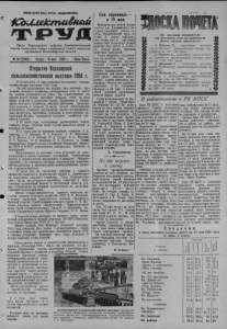 ПРОЛЕТАРИИ ВСЕХ СТРАН, СОЕДИНЯЙТЕСЬ! iC bU ueicm u& Hm i Орган Карасукского райкома Коммунистической партии Советского Союза и районного Совета депутатов трудящихся Новосибирской области №58(2398))! Среда, 14 мая 1958 г. jЦена15коп. Открытие Всесоюзной сельскохозяйственной выставки 1958 г. В воскресенье 11 мая открылась Всесоюзная сельскохозяйственная выставка 1958 года. На ней представлено все лучшее, чего добились труженики сельского хозяйства, раскрываются пути и способы, какими достигается их успех. На торжественное открытие нового сезона выставки прибыли гости из всех краев, областей и республик страны. Передовики и специалисты сельского хозяйства, научные работники, руководители колхозов и совхозов. В числе гостей—представители коллективов столичных предприятий, научно-исследовательских институтов, партийных, советских и общественных организаций Москвы, трудящиеся сельского хозяйства столичной области. В 10 часов утра гостеприимно распахнулись ворота главного входа. Десятки тысяч гостей заполнили аллеи и площади выставки. В И часов дня на выставку прибыли товарищи А. Б. Аристов, Л. И. Брежнев, Н. Г. Игнатов, А. И. Кириченко, Ф. Р. Козлов, А. И. Микоян, М. А. Суслов, Е. А. Фурцева, Н. С. Хрущев, Н. М. Шверник, П. Н. Поспелов, а также руководители правительства Российской Федерации, министры СССР и РСФСР, руководители центральных ведомств и учреждений. Находившиеся на выставке гости встретили их аплодисментами и приветственными возгласами. Руководители партии и правительства направились в павильон «Машиностроение», где осмотрели выставку агрегатов для комплексной механизации и автоматизации производственных процессов в промышленности. 12 часов дня. На гранитных трибунах у главного павильона появляются руководители партии и правительства, передовики сельского хозяйства, Герои Социалистического Труда, представители партийных, советских и общественных организаций Москвы и Московской области, ученые. Собравшиеся на площади приветствуют их продолжительными аплодисментами. Митинг открыл председатель главного комитета выставки, министр сельского хозяйства СССР В. В. Мацкевич. С речами выступили председатель колхоза «Перемога», Минской области, Герой Социалистического Труда Т. И. Жи- галко, директор совхоза «Пятигорский», Ставропольского края, Герой Социалистического Труда И, А. Прудников, инженер Горьковского завода «Красное Сормово» Л. С. Попов. С большой речью выступил на митинге тепло встреченный собравшимися Первый секретарь ЦК КПСС,Председатель Совета Министров СССР В. С. Хрущев. Митинг окончен. Тов. Мацкевич объявляет выставку 1958 года открытой. Под звуки Государственного гимна Советского Союза над павильонами взвиваются флаги СССР и союзных республик. Начинают бить струи фонтанов. В воздух взлетают сотни голубей. Руководители партии и правительства направляются в павильон «Эстонская ССР». Здесь они осмотрели его прекрасно оформленные стенды, знакомящие с развитием всех отраслей народного хозяйства и культуры Эстонии. Особое Сев зерновых— к 15 мая Механизаторы второй фермы совхоза им. Дзержинского обсудили передовую статью газеты «Коллективный труд» от 9 мая. В статье замедленные темпы сева и заготовки земель был подвергнут резкой критике наш совхоз и особенно вторая ферма. Критика признана правильной. Чтобы поправить положе