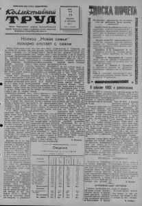 ПРОЛЕТАРИИ ВСЕл СТРАН, СОЕДИНЯЙТЕСЬ! 4СЬииекхпи£жш Орган Карасукского райкома Коммунистической партии Советского Союза и районного Совета депутатов трудящихся Новосибирской области Колхоз „Новая семья" позорно отстает с севом Колхоз «Новая семья» позорно отстает на весеннем севе. Правда, в бригадах есть не: редовые производственники Ежедневно перевыполняют нормы трактористы Александр Диль, Николай Игашев, Григорий Степаненко, Василий Реуцкий, Александр Белов. Многие механизаторы и колхозники тревожатся за судьбу урожая, прилагают все старания, чтобы в лучшие сроки закончить весенний сев. Однако мало разворотли- вости и оперативности в руководстве проявляют правление и партийная организация колхоза. В то время, когда другие колхозы района начали сев пшеницы в первых числах мая, то колхоз «Новая семья» приступил 11 мая. Не считаясь с особенностями нынешней весны, руководители колхоза строили свои расчеты на самые поздние сроки окончания работ. О сроках сева руководители, и прежде всего председатель т. Орлов, судили так: «Спешить с севом не следует, поздний сев даже лучше». И вот сейчас сказываются результаты такого мнения. В районе четыре колхоза закончили сев зерновых культур, другие завершают его, ‘ а «Новая семья» позорно отстаёт. Колхозу предстоит ещё засеять 2523 га зерновых культур, в том числе пшеницы 2176 га и подготовить 1500 гектаров земель. Особенно отстаёт третья бригада, которой нужно ещё засеять 1581 гектар зерновых культур и вспахать более 1000 гектаров. Несмотря на то, что бюро РК КПСС своевременно указало правлению и партийной организации колхоза па сдерживание начала весеннего сева, осудило их действия и обязало закончить весенний сев к 27 мая. Однако серьезных выводов из этого сделано не было. В бригадах после решения бюро изменений в лучшую сторону не произошло. Больше тою, если в 3-ю пятидневку было засеяно 1637 га, то в 4-ю пятидневку почти в два раза меньше. Председатель колхоза тов. Орлов и секретарь партийной организации т. Мухамедчин организацией более производительной работы тракторов по-настоящему не занимаются. Товарищ Орлов с мнением бригадиров комплексных бригад не считается. Так, 19 мая без ведома бригадира второй бригады им был снят трактор «ДТ-54» с посева и послан на подготовку земли для кукурузы, в результате чего сцеп трех сеялок целый день простоял, хотя подготовленная земля в бригаде имелась. Товарищ Орлов с механизаторами советуется мало, относится к ним грубо, употребляет по отношению к ним недостойные выражения. Часть техвики простаивает по техническим неисправностям, однако механик колхоза И. Кругликов энергичных мер к устранению их не принимает. Так,трактор «С-80» в третьей бригаде работает плохо, на пахоте делает по 1— 2 круга в смену, сильно перерасходует масло из-за непригодности поршневой группы. Но тов. Кругликов успокаивает трактористов пока подождать и только обещает списать перерасход масла. Работу тракторов па весновспашке сдержива» т также неубранная с полей солома, которая повсеместно сжигается. Пахота в основном производится без предплужников, потому что, как выразился агроном колхоза Мухамедчин, этому мешают остатки недогоревшей соломы. Настоящей заботы о тех, кто решает судьбу сева, не проявляется. Питание организовано плохо Так, в третьей бригаде нет никаких жиров. Поварих