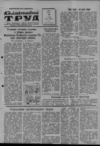 1 i ПРОЛЕТАРИИ ВСЕХ СТРАН, СОЕДИНЯЙТЕСЬ! 1СЫие!спш&тй Орган Карасукского райкома Коммунистической партии Советского Союза и районного Совета депутатов трудящихся Новосибирской области__________ 1058 ИЮЛЬ 5 0 Среда №91 (2431) Цена 15 копеек. Наштруд— на дело мира V Успешно готовить технику к уборке урожая Механизаторы Октябрьского отделения РТС плохремонтируют комбайны Из ремонта... в ремонт Несколько дней отделяет ев, механик но сельхозмаши- нас от жатвы. Сейчас идут но- нам И. Крамской и главный следние приготовления хлебо- инженер бывшей Октябрьской уборочной техники. И от того, МТС И. Глазунов, принимая насколько качественно отремон эти машины из ремонта? тирована техника, будет зави- Следует также сказать и о сеть успех в уборке богатого тех виновниках, которые реурожая. монтировали комбайн № 37. В этом году я закончил кур- Это комбайнеры Николай Гехт, сы комбайнеров и мне впервые Александр Мергель и Егор доверят самостоятельно во- Бендер. Они,по-видимому, счи- дить степной корабль. Правда, тали, что готовят к работе не на ремонте я не был, так «свои», а «чужие» машины, как после курсов трудился в а поэтому действовали по прин колхозе по механизации тру- ципу: «скорее бы спихнуть эти доемких процессов в животно- комбайны комиссии и получить водстве. А комбайн для рабо- за ремонт деньги». Так оно и ты я получил на днях. Буду получилось— деньги за ремонт убирать урожай в сельхозарте- получены, а комбайны к рабо- ли им. XX партсъезда. 24 ию- те и до сих пор не подготов- ля я принял комбайн «Стали- лены. нец-6» № 37, отремонтирован- Я думаю, что за качество ный Октябрьским отделением работы нужно бороться всегда ремонтной станции. и везде, где бы ты только не Но „аково же быв. мое в Г Г г Г 1 Г Сверенной монт? хлебоуборочной техники, верить готовность вверенной доджно быть совесТво и с них T S ktP Rot пркптп- необходимо взыскать по заслу- узел, то дефект. Вот некою рые из них: в трех местах лопнула основная рама— тре- #буетса электросварка. Эти места как были наспех связаны цепями еще в прошлую уборку, так и остались. Совершенно негодными оказались подвески первой и второй очистки.Рассыпанным оказался подшипник вентилятора первой очистки. Вырваны болты круга первогоколеса и ряд других неисправностей. И это не един ственный комбайн с такими дефектами. Неизвестно, куда смотрели механик-контролер Ж. Адаспагам. П. Литау, М ОЛОДЕЖ Ь ВПЕРЕДИ На сенокосных угодьях колхоза «Жол Сталина» почти круглые сутки не смолкает рокот моторов и шум сенокосных агрегатов. Здесь прилагают все усилия к тому, чтобы до начала массовой уборки урожая обеспечить животноводство кормами. Уже заготовлено около 60 процентов кормов. Лучших результатов добилась первая комплексная бригада К. Сареембаева. Она заготовила около 3000 центнеров сена и свалила травы на 740 гектарах. Здесь тракторист Г. Хиематулин, буксируя трехбруску трактором «ДТ-54», ежедневно скашивает по 25— 30 гектаров вместо 20 по норме. На «ДТ-24» с прицепными сенокосилками выполняют норму на Н О — 115 процентов В. Гончаров, К. Яизамутди- нов и Г. Ахметов. По 20— 25 центнеров подвозят к животноводческим фермам на расстояние до 4— 5 км С.Кан дыкеров, Б. Койчубаев, К. Тугаев. Добросовестно относятся к своим обязанностям на копнении сена подростки Исполова, Байгаринова, Битено- ва и Рыспаева. Комсомольцы и молодежь принимают активное участие в скирдо