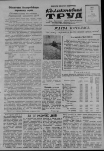 2 КОЛЛЕКТИВНЫМ ТРУД 6 августа 1958 года, № 94 Сотрудничество ССРС и КНР в интересах всеобщего мира С 31 июля по 3 августа в Пекине состоялась встреча Первого секретаря Центрального Комитета КПСС, Председателя Совета Министров СССР Н. С. Хрущева и Председателя ЦК Компартии Китая, Председателя Китайской Народной Республики Мао Цзе-Дуна. В коммюнике об итогах встречи говорится,что обе стороны в обстановке исключительной сердечности и теплоты обсудили важные вопросы современного международного положения, укрепления дружбы и взаимной помощи между СССР и КНР, а также вопросы совместной борьбы в защиту мира во всем мире и отметили полное единство своих взглядов. СССР и КНР сурово осуждают грубые агрессивные действия США и Англии в районе Ближнего и Среднего Востока и требуют безотлагательного созыва совещания глав правительств великих держав для обсуждения создавшегося положения. Они решительно настаивают на немедленном выводе ‘ войск интервентов из Ливана и Иордании. Обе стороны заявили, что они решительно поддерживают справедливую борьбу народов арабских стран, а также национально-освободительное движение народов Азии, Африки и Латинской Америки. Советский Союз и Китайская Народная республика достигли полной договоренности относительно тех мероприятий, которые должны быть приняты для борьбы против агрессии и для сохранения мира. В коммюнике указывается, что первоочередной задачей для сохранения и упрочения мира является достижение соглашения между государствами о сокращении вооружений, прекращении испытаний и запрещении применения атомного и водородного оружия, о ликвидации всех военных группировок и военных баз, созданных на чужой территории, о заключении пакта мира и коллективной безопасности. Советский Союз и Китайская Народная Республика предупреждают, что если воинствующие империалисты, одержимые манией установления своего господства над всем миром, осмелятся навязать войну народам, то все миролюбивые и свободолюбивые государства и народы, тесно сплотившись воедино, навсегда покончат с империалистическими агрессорами и утвердят вечный мир во всем мире. Обе стороны выражают полную уверенность в том, говорится в заключение коммюнике, что растущие изо дня в день силы мира и социализма безусловно преодолеют все препятствия на пути движения вперед и одержат великую победу. Коммюнике подписали Н . Хрущев и Мао Цзе-Дун. (ТАСС). * Обсуждают готовность куборке урожая Хороший урожай растет наполях совхоза им. Дзержинского. Чтобыубрать его всжатые сро- кщнужна тщательнаяподготовка всех средств механизации, а также кадров. На днях здесь собрались управляющие фермами, бригадиры тракторно-полеводческих бригад, трактористы и комбайнеры, чтобы обсудить готовность кмассовой уборке зерновых. В это время выборочная косовица ячменя в совхозе уже началась. Главный агроном совхоза т. Кармазин сообщил, что совхоз завершил подготовку техники и при наличи 34 комбайнов и 15 жаток имеет возможность произвести уборку всех зерновых не более как за 18—20 рабочих дней. Для этого нам непременно придется использовать спарен ные агрегатына жатве хлебов и подборке. Это предложение агронома нашло одобрение комбайнеров они охотно заявили о готовности работать на спаренных агрегатах на жатве и подборке. —Успех уборки во многом будет за