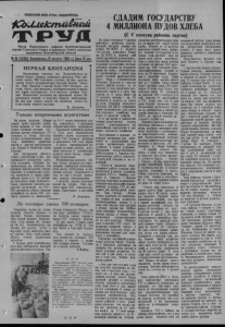 ПРОЛЕТАРИИ ВСЕХ СТРАН, СОЕДИНЯЙТЕСЬ! iChUujeJcrnuiusM Орган Карасукского райкома Коммунистической партии Советского Союза и районного Совета депутатов трудящихся Новосибирской области №96 (2436)1 Воскресенье,10августа 1958 г.1 Цена 15коп. П Е Р В А Я К В И Т А Н Ц И Я *' Труж еники совхоза им. Дзержинского ус нешно ведут у б ор ку зерновых культур . Уж е ско шено около 900 гектаров хлебов. Лучше других ж а тв у ведут механизаторы третьей фермы совхо за. Они свалили в валки более 350 гектаров яч меня. Здесь уже началась подборка валков и прода ж а зерна государству . 8-го августа шофер Степан Никитенко доставил на приемный пункт 56 центнеров ячменя и получил первую квитанцию. За два дня совхоз вывез на элеватор более 15 тонн зерна нового урожая . М. Андреев. Только спаренными агрегатами На полях колхоза «Новая семья» зреют хорошие хлеба. Чтобы вовремя и без потерь убрать богатый урожай, труженики артели тщательно готовились к этому. Они полностью отремонтировали трактора, комбайны, лафетные жатки и другую необходимую для уборки и обработки зерна технику. Для обсуждения рабочего плана хлебоуборки и мер материального поощрения здесь было проведено собрание механизаторов, на котором они приняли обязательства: уборку зерновых и технических культур завершить в самые кратчайшие сроки и к 25 сентября выполнить план хлебозаготовок, ежедневно доводить выработку на агрегат до 150— 200 процентов, убрать каждым комбайном не менее 600 гектаров зерновых и намолотить по 6— 7 тысяч центнеров хлеба, сэкономить 5 процентов горюче-смазочных материалов. Передовой комбайнер артели А. Трот взял обязательство скосить своим агрегатом не менее 700 гектаров пшеницы и намолотить 840 тонн зерна. В целях максимальной загрузки техники решено косовицу зерновых и технических культур вести только спаренными агрегатами. Механизаторы колхоза «Новая семья» вызвали на соревнование хлеборобов сельхозартели имени Куйбышева и выразили полную уверенность в том, что они с честью выполнят взятые обязательства. 6 августа первые агрегаты вышли на уборку. Уже скошено около 200 гектаров рыжика. Приступили к косовице овса. В. Деренок, З а полторы смены 100 гектаров Уборочная страда на полях колхоза «Заветы Ильича» в разгаре. Однако перепадающие дожди мешают нормальному ходу жатвы. Но несмот ря на это, механизаторы при лагают все усилия, чтобы в короткие сроки закончить жатву хлебов. Весь хлеб решено убрать только раздельным способом. С первых дней комбайновые агрегаты добиваются высокой производительности труда. Так Степан Степанович Жуков сце пом двух комбайнов «РСМ-8» за полторы смены свалил в валки 100 гектаров ячменя. По две нормы в смену дают комбайнеры на «РСМ-8» Сте пан Пабот и Григорий Болтен- ков. Уже скошен по колхозу весь рыжик на площади 352 гектара и свалено в валки 182 гектара ячменя. Готовим ся к жатве пшевицы. Е,Майер. Молдавская ССР. Колхоз име ни Сталина первым в Теле- нештском районе закончил косовицу хлебов и прист упил к продаже зерна государству. Пересмотрев свои возможности, хлеборобы, арт ели р еш и л и отправить на хлебоприемные пункты 400 тонн хлеба вместо ранее запланированных ЗОО тонн. На снимке: очистка зерна на току колхоза имени Сталина перед отправкой на хлебоприемный пункт . На переднем плане— председатель колхоза B. В. Георгиу (слева) и агроном комплексной бригады № 2 C. Ф. Желяп. ☆ 