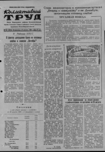 ПРОЛЕТАРИИ ВСЕХ СТРАН, СОЕДИНЯЙТЕСЬ) IC bU M /cm u tiuM Орган Карасукского райкома Коммунистической партии Советского Союза и районного Совета депутатов трудящихся Новосибирской области Ns102(2442)1 Воскресенье, 24 августа, 1958 г.Щона15 коп. В Райкоме КПСС 0 фактах допущения брака на косовице хлебов в совхозе „Октябрь" Коллектив рабочих совхо за „Октябрь" вырастил нын че на своих полях хороший урожай и взял на себя обя зательство скосить все хле ба раздельным способом, в сжатые сроки и без потерь, дать Родине миллион пудов добротного хлеба. Но как показывают факты дирекция и партийная орга низация совхоза относятся к выполнению своих обяза тельств несерьезно. Косови цу хлебов здесь начали с запозданием, половина всех агрегатов не оборудована освещением для работы в ночное время, некоторые ме ханизаторы плохо владеют машинами. Первые дни показывают, что многие ком байнеры и машинисты жа ток не справляются с зада ниями. Средняя выработка на каждый работающий ре жущий аппарат не превы шает 14 гектаров. В совхозе плохо поставлен контроль за качеством уборки, поэтому с первых дней допускаются потери зерна' На 9 ферме (управляющий тов. Бехтольд) комбай нер Шевченко и тракторист Тюник произвели косовицу овса на двух гектарах с высотой стерни до 50 санти метров, в результате валки провалились на землю. Этот же агрегат скосил 150 га пшеницы с огрехами и на высоком срезе. На этой и некоторых других фермах первые валки ложат на дороги, по ним ездят на машинах, зерно пропадает. На ферме № 6 комбайнеры Любин и Кортун скосили 156 га пшеницы с огрехами, валки вынесли на дорогу. Обо всех этих безобраз ных фактах не мог не знать главный агроном совхоза т. Вахромеев, но он мирил ся с этим,не наказывал брако делов. Он не организовал строгого приема полос после косовицы, на всех фермах в учетных листах не простав лялось качество уборки. Бюро РК КПСС 22 авгус та заслушало руководителей совхоза по вопросу качества уборки и сделало соответ ствующие выводы. Главный агроном совхоза Вахромеев с работы снят, управляющий 9 фермы Бехтольд исклю чен из партии. Руководители совхоза пре дупреждены о строгой их ответственности за качество и темпы уборки урожая. Перед ними поставлена за дача до 1 сентября завер шить косовицу хлебов, а к 15 сентября закончить под борку и обмолот валков и выполнить свои обязатель ства—дать государству не менее миллиона пудов хлеба. С в е д е н и я о ходе уборки зерновых и хлебосдаче на 23 августа 1958 г. (в процентах к плану) Колхозы и совхозы Скошено зерновых Сдано всего зерна Им. Тельмана 58,5 1,5 «Маяк Ильича» 42,0 1,7 «Вперед к коммунизму» 97,5 9,4 «Жол Сталина» 50,5 0,1 «40 лет Октября» 41,0 1,7 Им. XX партеъезда 52,0 5,4 Им. Джамбула 90,0 — «Заветы Ильича» 61,5 0,4 «Иуть Ленина» 49,4 9,2 Им. Куйбышева 37,0 8,1 «Новая семья» 14,9 1,2 Им. Жданова 43,0 3,4 По колхозам 48 ,2 3,1 совхозы Им. Дзержинского 63,0 5,4 «Октябрь» 43,0 7,6 По совхозам 49,0 6,8 По району 48 ,4 4 ,0 Слава механизаторам и колхозникам артелей „Вперед к коммунизму** и им. Джамбула, закончившим косовицу хлебов! Т Р У Д О В А Я П О БЕД А WWfrWVMWWюг*-*** Труженики сельхозартели имени Джамбула на первом этапе борьбы за хлеб добились крупной трудовой победы: 23 августа вслед за колхозом , Вперед к коммунизму' они на всей площади в 2754 гектара завершили жатву зерновых в валки. Самоотверженному труду колхозников и механизаторов артели способствовало широко развернутое 'Со