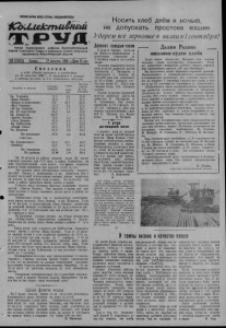 КОЛЛЕКТИВНЫЙ ТРУД 27 августа 1958 года, № 103 До 10 сентября валки будут подобраны и обмолочены В колхозе им. Джамбула агрегат из сцепа двух комбайнов, который возглавляет Андрей Васильевич Бауэр, является передовым. За штурвалами стоят сын комбайнера Василий и Карл Бейфус, буксируют сцеп, трактористы Сергей Додонов и Федор Кнаус. Еще до начала хлебоуборки экипаж А. Бауэра на собрани механизатороввзял обязательство скосить в валки 1000 гектаров зерновых и намолотить не менее 10 тысяч центнеров хлеба. Свое слово механизаторы держат. Они ежедневно при эадании 29 гектаров скашивают по 80—90, а в отдельные смены 100—108 гектаров пшеницы. До двух—трех нормв смену дают агрегаты комбайнеров Якова Ивановича Ганамана, Григория Гавриловича Крамского, Владимира Ивановича Дорофеева инекоторых других. Здесь нет ни одного механизатора, который бы не выполнял дневного задания. Этому способствует хорошо организованное социалистическое соревнование, правильная расстановка механизаторских кадров и меры материального поощрения. Как правило, во главе каждого агрегата стоит опытный механизатор. Все дизельные трактора обеспеченны водителями для двухсменной работы, что намного облегчает их труд и повышает производительность. Рабочий день механизаторов начинается вшесть часов утра. В результате тщательного и заботливого ухода машины работают по 18—19 часов без остановок. Обедают и ужинают механизаторы прямо на полосе. На случай поломки агрегатов в артели организована ре монтно-аварийвая бригада, в которую входят механик колхоза, бригадир тракторно-поле водческойбригадыиего помощник. Все они обеспечены ско- ростным транспортом передвижения. 22 августа, например, здесь был такой случай. Не успели выехать в поле, как вагрегате т. Дорофеева вышла из строя жатка—сломалась шестеренка коробки передач. Чтобыне дер жать весь агрегат, жатку отцепили. Комбайнер Дорофеев продолжал косьбу, а механик колхоза Ж. Адаспаев, снявшее теренку, отправился в РТС. Через час лафетная жатка бы ла пущена снова в работу. Над колхозом шефствует кол дектив работников райпотребсоюза. Как и на заготовке кормов для скота, так и на хлебоуборке они показывают образцы самоотверженного труда и высокой дисциплины. Они работают днем и ночью. На току, на машинах, идущих от комбайна в поселок, соломокопнителях, закладке'силоса и других работах—всюду виден честный труд продавцов, работников конторы, служащих райпотребсоюза. Благодаря напряжению всех сил колхозников, механизаторов и помощи шефво артель имени Джамбула одна их первых в районе за 10 рабочих дней на всей площади завершила жатву хлебов в валки. Первая трудовая победа завоевана. Джамбульцы полны решимости так же успешно, как и на первом этапе борьбы за хлеб, подобрать и обмолотить все валки и досрочно рассчитаться с государством попро даже хлеба. Но случаю завершения ко совицы хлебов 25 августа в колхозе состоялся митинг. На вагончиках, расположенных друг против друга, соблюдая строгую симметрию, вывешены плакаты, лозунги, диаграммы. Тружеников колхоза с первой трудовой победой тепло поздравили секретарь РККПСС т. Клочков, начальник райсель хозинспекции т. Смирнов. Под гром аплодисментов за систематическое перевыполнение дневных заданий на косовице хлебов лучшим механизаторам были вручены денежные премии и Почетные грамо