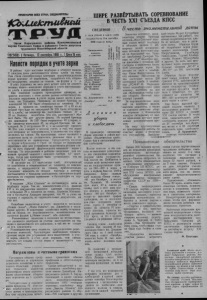12 сентября 1958 года, № 110 КОЛЛЕКТИВНЫЙ ТРУД В РК КПСС Оплохомкачестве убоиркурожая в колхозе „40 лет Октября'1 В колхозе «40 лет Октября»- на косовице хлебов и подборке валков допускали брак в работе. В некоторых бригадах поля для уборки не подготавливались, не производились прокосы и обкосы полос. Во многих случаях прокосы производились прицепными жатками, много хлеба приминалось, втаптывалось в землю, при обкосах валки укладывались прямо в траву, на дороги и после не подбирались. Много хлеба терялось при подборке и обмолоте. Контроль за качеством уборки отсутствовал, борьба с бракоделами не велась. В 1 и 2 бригадах с большими потерями убиралось сортовое зерно. Агроном райсемхо- за т. Белованцев не организовал нормальную приемку, хранение и подработку сортовых семян. Для этой цели оказались неподготовленными тока, очистительные машины и зер- - иохранилища. < Этот вопрос был обсужден на бюро РК КПСС. За плохое качество уборки, большие потери хлеба и непринятие мер к бракоделам председателю колхоза Д. Петухову бюро объявило' строгий выговор с занесением в учётную карточку. Строгие партийные взыскания получили также главный агроном т. Клочко, бригадир комплексной бригады т. Авраменко. Бюро предупредило агронома райсемхоза т. Белованцева, что если он не поправит дело с сортовым зерном, то будет снят с работы и привлечен к уголовной ответственности. Бюро указало секретарю парторганизации т. Лопину на его либеральное отношение к бракоделам на уборке и потребовало повысить требователь ность и ответственность бригадиров, агрономов, всех коммунистов за качество уборки урожая. Не создают нормальных условий для труда и отдыха На строительство нового элеватора в СМУ запсибхлебост- роя мы прибыли из разных мест месяца два назад. С большим трудом розыскав ко- г менданта Б. Дедловского, мы попросили где-нибудь устроить на жительство. Нас поселили в грязное, неубранное, неприспособленное, для общежития помещение. Трудно поверить, что раньше здесь был красный уголок. Здесь в кучу свалены трибуна, скамейки, плакаты, "окна выбиты. Поставили нам койки с одной, двумя досками, на которых за ночь не отдохнешь, а намаешься. Дали грязный бачек для воды. Кран в нем не работает, и он постоянно пустой, так как техничка приносит пару ведер воды один раз в неделю. В коридоре вывалилась стена, и никто ее в течение полумесяца не заделывал. До нашего приезда здесь жили девушки и нам предложили жить вместе с ними. Девушки и мы вынуждены спать, не раздеваясь. Мы неоднократно обращались к начальнику CM Y j. Фофа нову,председателю местного комитета профсоюза с просьбой благоустроить общежитие, но они не обращают внимания. А когда т. Фофанов проходил мимо общежития в обеденный перерыв, и мы все пригласили зайти к нам, он грубо ответил: — Если вам необходимо поговорить, придите ко мне в кабинет. Невелики шишки. Нас возмущает такое отношение руководителей к молодым строителям. Придешь с работы, умыться нечем. Столовой нет здесь, а в город не успеваем сходить. Приготовили бы сами что-нибудь покушать, но нам не дают топлива. В магазине, кроме водки, почти нет никаких продуктов. Всем рабочим выписали пропуска в баню, а живущим в общежитии не дают. На работе главный инженер Б. Восковский вместо толкового разъяснения ругается и грубит. Мы просим посодействовать нам в создании нормал
