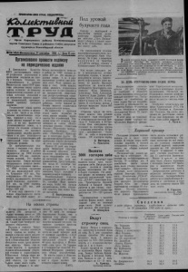2 КОЛЛЕКТИВНЫЙ ТРУД 21 сентября 1958 гоа, № 114 V В честь X X / съезда КПСС Дружно включились в соревнование Весть о созыве внеочередного X X I съезда Коммунистической партии Советского Союза застала бригады строителей нашего поезда в самых различных местах за выполнением своих дел. Все бригады, ознакомившись с постановлением Пленума ЦК КПСС о созыве съезда, дружно включились в соревнование за достойную встречу этого знаменательного события. Строители трудятся в эти дни с полным напряжением сил. Хороших успехов добивается комплексное звено каменщиков- землекопов Петра Ва- лентукевича. Работая на рытье и укладке теплотрассы на строительстве восьми-и двенадцатиквартирных домов на станции Карасук-I, звено довело выработку ежедневно до двух норм. 23 путейца бригады Андрея Михайловича Дуракова, работающие на балластировке пути Карасук — Камень-на-Оби на участке около станции Зубково, выполняют сейчас задания на 150 процентов каждый день. Активно, с огоньком трудятся 20 молодых рабочих бригады Меринова, прибывших к нам в начале августа по комсомольским путёвкам из Воронежской области. Успешно освоив новые специальности, С большим подъемом С большой радостью встретили работники нашего отделения 'РТС весть о созыве внеочередного XXI съезда КПСС. Зная, что контрольные цифры дальнейшего развития народного хозяйства СССР, которые рассмотрит и примет съезд, явятся новой вехой на пути строительства коммунизма, работники станции еще с большим подъемом трудятся в эти дни на своих участках. Первенство в развернувшемся социалистическом соревновании держат кузнец Григорий Лисуков и молотобоец Анатолий Костылев. Изготовляя самые разнообразные заказы, поступающие из колхозов по ремонту уборочной техники, они выполнили задание за 20 дней сентября на 215 процентов. С полным напряжением сил трудятся опытные токари Альберт Кнаус и Федор Шнайдер. Их ежесменный показатель—180—190 проц. к заданию. До двух норм в смену дает слесарь Геннадий Поляков. Неплохих успехов добился молодой электросварщик Александр Крикунов. Пройдя обучение в нашей станции, он уже в первый год работы выполняет сложные заказы с высоким качеством и раньше срока. Встав на трудовую вахту в честь XXI съезда партии, Крикунов дает по полтора задания в смену. Л. Жевелева, заведующая Чернокурьинским отделением РТС. комсомольцы с первых дней Йоказывают^пример в труде. е бывает такого дня, чтобы они не перевыполнили доведенное задание. В результате добросовестного отношения к делу августовское задание комсомольцами выполнено на 132 процента. А. Облап, бухгалтер СМП-233. Передовые водители Воодушевленные сообщением о созыве X X I съезда Коммунистической партии Советского Союза, водители автомашин коммунист Алексей Конд- ратьевич Кусов и Михаил Иванович Агапов, работающие в колхозе «Новая семья», показывают образцы самоотверженного труда, Транспортируя зерно от комбайнов на колхозный ток, они делают в сутки по 15 и более рейсов. Шоферы внимательно следят за машинами, своевременно проводят техосмотры и аккуратно водят их. В результате бережного обращения машины всегда на ходу. Алексей Кусов и Михаил Агапов не сидят без дела во время остановки уборочных агрегатов. Они сразу же загружают машины очищенным хлебом и везут его на элеватор. Только за последние 15 дней шофер Алексей Ку сов сделал свыше ч