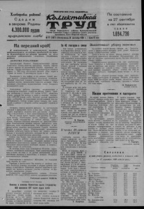 Хлеборобы района! С д а д и м в занрома Родины 4.300.000 пуодв кулундинского хлеба! ПРОЛЕТАРИИ ВСЕХ СТРАН, СОЕДИНЯЙТЕСЬ! 4СЬиаекхпи£нш Орган Карасукского райкома Коммунистической партии Советского Союза и районного Совета депутатов трудящихся Новосибирской области №117 (2457) |Воскресенье,28 сентября1958 г. |Цена15 копПо состоянию на 27 сентября в счет обязательства с д а н о 1.694.736 На передний край! К комсомольцам и комсомолкам, молодым м ехани зат ора м, молодежи, прибывшей и з города Новосибирска на уборк у урожая, ко всем молодым работникам . сельского^ хозяйст ва района . Д О Р О Г И Е Т О В А Р И Щ И ! Центральный Комитет Коммунистической партии Советского Союза наметил программу борьбы партии и всего народа за дальнейший подъём зернового хо зяйства. Партия поставила ясную, конкретную и боевую задачу: к I960 году обеспечить валовой сбор зерна в стране не менее 11 миллиардов пудов в год. Вдумаемся в эту цифру, и мы увидим новый расцвет нашего социалистического сельского хозяйства. Каждый советский человек, принимая близко к сердцу указание партии, преисполнен горячего желания стать активным участником осуществления этого большого всенародного дела. Колхозники, рабочие совхозов, механизаторы и специалисты сельского хозяйства района, горячо одобряя сообщение о созыве XXI съезда КПСС , обязались убрать урожай без потерь и сдать в закрома государства 4.300.000 пудов хлеба. Богатый урожай вырастили наши хлеборобы, но дождливая погода вызвала кое-где растерянность. Сейчас нужно прямо сказать, что положение в районе с уборкой хлебов вызывает серьёзную тревогу. Осталось совсем немного времени до наступления холодов и выпадения снега, а нам еще нужно успеть убрать картофель, поднять зябь для посева будущего года и подготовить к зиме животноводческие фермы. Мы не имеем права строить свои расчёты на хорошую погоду. Необходимо вести подборку валков и сдачу хлеба государству в любую погоду, днем и ночью, обращая большое внимание на качество обмолота. Комсомольцы должны широко разъяснять комбайнерам, всем механизаторам, что выжидание и раскачка сейчас подобны преступлению. Судьба богатого турожая в наших руках. Комсомольские организации 'должны добиться, чтобы не было ни одного комсомольца и молодого рабочего, который бы не участвовал в этом патриотическом движении. Сейчас еще более, чем когда-либо должны активизировать свою работу комсомольские контрольные посты по борьбе с потерями. Хороший пример в этом показывают комсомольцы артели „Жол Сталина11. Они выступают инициаторами подборки валков в ненастье, зорко следят за качеством. 29 октября этого года исполняется 40-летие героического ленинского комсомола. Твой самоотверженный труд в поле, на току и за рулем автомашины будет достойным вкладом в подготовку к встрече большого комсомольского юбилея. Комсомольцы и молодежь! Выходите на передний край борьбы за хлеб! Пионеры и школьники! Вы можете и должны оказать большую помощь колхозам в уборке урожая зерновых и картофеля. Районный комитет комсомола призывает вас принять активное участие в походе за скорейшее завершение уборки. Ознаменуем приближающееся славное 40-летие ВЛКСМ , XX I съезд КП СС новыми трудовыми успехами. Районный комитет ВЛКСМ. Колхозы и совхозы Казахстана сдали государству 603 миллиона 587 В труднейших условиях осеннего ненастья проходи