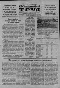 Хлеборобы района! С д а д и м в закрома Родины 4.300.000 пудов кулундинского хлеба! ц**т ПРОЛЕТАРИИВСЕХ СТРАН. СОЕДИНЯЙТЕСЬ! 1CblU£kxrui&Heiu Орган КарасугАкого райкома Коммуннстяческой партии Советского Союза и районного Совета депутатов трудящичди Новосибирской области №118 (2458) 1 Среда, 1 октября 1958 г. ! Цена15 коп По состоянию на 30 сентября в счет обязательства с д а н о 1.848.619 пудов Довести выработку на каждый комбайн но менее 40 гектаров в смену После продолжительного ненастья установились благоприятные для уборки хлебов дни. Сознавая важность стоящих перед нами задач, мы обращаемся к механизаторам колхоза „40 лет Октября1 еще выше поднять темпы хлебоуборочных работ, довести выработку на каждый комбайн до 40 гектаров в смену, и на этой основе завершить подборку зерновых не позднее 5 октября. Такая задача по плечу каждому агрегату, если все механизаторы будут трудиться добросовестно, не жалея сил, с полной нагрузкой использовать технику. Правильность наших выводов подтверждена уже практически. 27 сентября двумя комбайнами „С-6И мы подобрали валки с площади 56 гектаров,—около двух норм на агрегат. На следующий день с 9 часов утра -V до 3 часов ночи мы подобрали валки пшеницы на 82 гектарах—более 40 гектаров на комбайн. Теперь на технический уход и заправку машин наш агрегат тратит не более часа—наполовину меньше, чем это было раньше. Обедаем и ужинаем непосредственно у агрегатов. Чтобы механизаторы на протяжении 18 часов могли плодотворно трудиться, мы поочередно отдыхаем, подменяя друг друга. Важную роль играет своевременная разгрузка зерна из бункеров комбайнов. С этой задачей у нас успешно справляется водитель автомашины „ЗИС“ Нико лай Халимон. Он один успевает обслуживать два комбайна, разгрузку делает на ходу. Строгое выполнение распорядка дня, ревностное отношение всех членов экипажа к своим обязанностям и правильная эксплуатация техники обеспечили нам возможность скосить и подобрать уже около 1000 гектаров зерновых. Сейчас мы прилагаем все силы к тому, чтобы до 5 октября подобрать все валки и с честью выполнить обязательство по хлебозаготовкам. Механизаторы бригады №10 колхоза *40 лет Октября" Е. ДОРНЕС—комбайнер, В. МЕРЕНЦОВ—тракторист, И. ДИБРОВА—штурвальный, Н. ШЕДЕНКО—копнильщик. Есть план хлебозаготовок! 30 сент ября хлеборобы колхоза , Вперед к к омм уни зч у“ одержа ли большую т р удо ­ в ую победу—первыми в рай он е выполнили п л а н хлебозаготовок. Г осударст ву продано 20 тысяч центнеров хлеба. Но ст рада не закон ч ен а . Н а полях по-прежнему гудят комбайны, на токах ст р ек оч ут зернопо ­ гр у зчи ки и зерн оочи ­ стит ельные машины, по дорогам на элеват ор ид ут груженные зерном машины —колхозники сдают хлеб в счет своего обя зат ел ьст ва . Э. Иванов. Вторую тысячу гектаров Добросовестно трудней на полях второй бригады артели «Заветы Ильича» комбайновый агрегат Степана Пабота, где штурвальный Иван Шнайдер и тракторист Александр Зимбаль. С начала жатвы агрегат уже убрал более тысячи гектаров хлебов: свалено в валки 620 гектаров и около 400 гектаров подобрано и обмолочено. В эти дни агрегат С. Пабота трудится с особым напряжением. Он ежедневно подбирает по 35— 36 гектаров хлебов. А. Шкитив. “ Колхоз .Родина" Шипуновского района, Алтайского края, руководимый Героем Социалистического Труда Ф. М. Гринько, ежегодно получает большие доходы. То