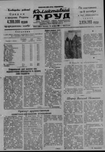 В честь XXI съезда КПСС Сверх годового плана Большой Трудовой пода- ства. Сейчас многие мастерок готовят XXI съезду род- ра, соревнуясь между собой, ной Коммунистической пар- не только выполняют смен- тин работники швейного це- ные нормы выработки, но ха завода строительных ма- значительно перекрывают териалов. Сразу же после их. Лучше других трудится постановления П л е н у м а мастер Иван Григорьевич ЦК КПСС о созыве съезда Маляренко. Его работа от- партии коллектив цеха взял лнчается всегда хорошим в честь этой знаменательной качеством Высокопроизво- даты почетное обязательст- дительно трудится на поши* во—выполнить годовой план ве женской верхней одеж- по выпуску товарной про- ды молодой мастер комсо- дукции раньше срока и молка Елена Сысоева. Высо- дать до конца года сверх кие показатели имеют так- плана готовых товаров на же мастера массового по- сумму 500 тысяч рублей, шива Анна Лукашенко. ЛпПринятое обязательство дня Рассказова и другие, успешно в ып о л н я е т с я . Сплоченный коллектив Швейный цех уже в сентяб- цеха полон решимости с ре закончил выполнение го- честью выполнить взятое дового плана и начал вы пускать продукцию в счет сверхпланового обязательОбязательство будет выполнено К 20 октября подготовить центнеров молока больше по все сепараторные отделения сравнению с прошлым го- к работе в зимних условиях, дом, „Маяк Ильича —на зюершить выполнение го- 500 центнеров, им. 1ельма- дового плана по заготовкам на—на 300 центнеров. По молока к концу октября-— 400—800 литров молока от такой подарок готовит пред- каждого индивидуального стоящему XXI съезду пар; хозяйства заготовили заветен коллектив работников дующие Чуманским, По Карасукского маслозавода, кровским и Токаревским сеПодведенные итоги сорев- параторными отделениями нования работников завода тт. Е. Шаравина, М. Голу- на 1 октября показывают, беи и В. Ляшенко. что взятое обязательство в Чтобы скорее завершить честь съезда будет выпол- выполнение годового плана, нено. Завод выполнил годо- все заведующие сепаратор- вой план на 90 процентов, “ными отделениями решили в заготовив молока на 12.777 октябре заготовить от каж- центнеров больше, чем было дого индивидуального сдат- на эту же дату в прошлом чика не менее чем по40 лит- году. Колхоз „Вперед к ров молока, коммунизму* сдал на 700 Готовить общественному животноводству телпюу и сытую зимкоув обязательство. м. Васильев. Пвежм доярок артели „Впе Уредк коммунизму0 развернулось соцммиеткческое соревнование в чвс*в предстоящего XXI съевда .партии. Соревнование предусматривает не только борьбу за первенство, но постоянную передачу опыта.АннаВвбе — опытная доарка, а Лидия Но вак стала работать'на ферме совсем недавно. Поэтому ова особенно внимательно изучает приемы передовых дояров. НА СНИМКЕ :доярки вол хоза „Вперед к коммунизму" Лидия Новак (слева) в Анна Внбе на дойке коров. Фото А. Шестопалова. СВЕДЕНИЯ о надоях молока на фуражную корову за первую пятидневку октября 1958 года Беззаботные хозяева В. Иванов. Наш календарь Великий итальянскийкомпозитор Наименование Надоено колхозов молока и совхозов в литрах Им. Тельмана 17,0 „Маяк Ильича* 21,9 „Вперед к коммун*. 21,2 „Жол Сталина* 20,0 „40 лет Октября* Им. 5 Л партсъезда 17,4 18,0 Им. Джамбула 18,0 „Заветы Ильича* 29,9 „Путь Ленина* 17/3 Им. Куйбышева 22,0 „Новая семья* 22,6 Им. Жданова 19,6 По яв л хвм я 19,7 Совхо