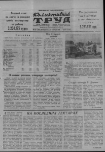 Годовой план по сдаче и продаже хлеба государству по району 3.234.125 пудов ПРОЛЕТАРИИ ВСЕХ СТРАН, СОЕДИНЯЙТЕСЬ! 1СЬимкти£шш Орган Карасукского райкома Коммунистической партии Советского Союза и районного Совета депутатов трудящихся Новосибирской области №123 (2463) !Воскресенье,12 октября 1958 г.? Цена 15 коп. По состоянию на 1 октября в счет обязательства с д а н о 3.241,831 пуд нтан С в е д е н и я о ходе уборки зерновых, выполнения плана хлебосдачи и уборке картофеля на 11 октября 1958 года (в проц.) К о л х о з ы и с о в х о з ы Подобрано и обмолоч. валков Сдано хлеба государству Убрано картофеля Им. Тельмана 81,3 68,2 48,3 «Маяк Ильича» 60,0' 95,4 95,0 «Вперед к коммунизму» 92,5 106,6 84,5 «Жол Сталина» 87,5 87,7 34,2 «40 лет Октября» 54,2 68,4 48,5 Им. IX партсъезда 91,5 111,8 6,6 Им. Джамбула 84,0 103,8 37,6 «Наветы Ильича» 83,0 92,0 9,8 «Путь Ленина» 90,5 109,1 45,0 Им. Куйбышева 70,5 101,9 39,0 «Новая семья» 71,5 111,8 43,5 0м. Жданова 63,5 92,7 34,4 совхозы 1м. Дзержинского 93,0 129,1 74,5 «Октябрь» 61,0 138,5 72,0 Под будущий урожай Уборка хлебов в колхозе «Вперед к коммунизму» подходит к концу. Сейчас стремления хлеборобов направлены к тому, чтобы полностью обеспечить заготовку земель под весь яровой клин будущего года. В артели уже поднято около двух тысяч гектаров зяби. Впереди идет вторая бригада» вспахавшая более 800 гектаров земли. Лучшие механизаторы Леонид Пшнчко и Федор Гаврюшеико на тракторе «С-80» за смену поднимают но 15— 16 гектаров земель. На 115— 120 процентов выполняют свои задания на «ДТ-54» А. Лель. Н. Сарапулов.В. Максименко и В. Сабровский. Добросовестно трудился на «ДТ-54 Владимир' Пшичко. Н. Кравцов. К новым успехам, товарищи хлеборобы! Вчера колхозы и совхозы района одержали большую трудовую победу, выполнив годовой государственный план но продаже хлеба. В закрома Родины засыпано 3.241.831 пуд кулун- динского хлеба. Эта большая победа завоевана са моотверженным трудом механизаторов, колхозников и рабочих совхозов ^района. Большую помощь хлеборобам Оказали рабочие и студенты, прибывшие на уборку урожая из г. Новосибирска. а также и Карасука. До стойный вклад внесли водители машин Карасукской автороты, колхозов и совхозов, а также предприятий и учреждений. Ощутимый вк ла д е счет трех миллионов пудов, сданных государству, внесли такие хозяйства, как совхозы „Октябрь", им. Дзержинского, колхо зы „40 лет Октября", „Путь Ленина". Совхоз „Октябрь", например, отгрузил в закрома Родины 105.634 центнера, выполнив план на 138.5 проц., на 129 проц. выполнил план совхоз имени Дзержинского, колхоз ,40 лет Октября“ сдал 88.418 цент., „Путь Денина"—42.178 ц. По это только первая победа. Колхозы им Тельмана, им. Жданова, „40 лет Октября", „Заветы Ильича", «М зяк Ильича »и „Жол Сталина" еще не выполнили своих планов, ни один колхоз не справился с обязательствами по продаже хлеба государству. Еще лежит в валках около 30 тыс. гектаров зерновых, не все колхозы запаслись семенами. Все эти вопросы надо решать немедленно, время не ждет, осень не балует хорошей погодой. R новым трудовым успехам, товарищи хлеборобы! Поревнуясь за достойную встречу XXI съезда КПСС, тле- и боробы Дробышевского района Омской области выполнили государственный план хлебозаготовок, в закрома Родины засыпано 5,о миллиона пудов зерна. Продажа и сдача хлеба продолжаются. Одним из первых в районе выполнил план продажи хле- ба^колхоз имени Рассохина. Сейчас здесь ведут засыпку се менного фонда и выдачу зерна на 