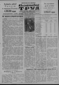 ПРОЛЕТАРИИ ВСЕХ СТРАН, СОЕДИНЯЙТЕСЬ! ICbUudcrnuiHsui Хлеборобы района! С д а д и м в закрома Родины 4,300.000 пудов килундинского хлеба! №124~С24647| Срёда~ш” октября 1958 г. ! Цена15 коп. орган Карасукского райкома Коммуннстической партии Советского Союза и районного Совета депутатов трудящихся Новосибирской области По состоянию на 14 онтября в счет обязательства с д а н о 3.258.412 пудов Не медлить с уборкой картофеля Картофель—не только ценная пищевая, но и кормовая культура. Колхозы и совхозы района посадили в нынешнем году более 1700 гектаров картофеля. И если вовремя убрать его и засыпать в надежные хранилища, то картофеля в достатке хватит на семена, для питания, для продажи государству и на корм скоту. Однако, как показывает опыт прошлых лет, руководители многих колхозов систематически не выполняют задания по сдаче и продаже картофеля и овощей государству. В прошлом году, например, только один колхоз им. Куйбышева успешно справился с планом сдачи картофеля. Годовое задание он выполнил на 123 процента. На 99 процентов выполнила план сельхозартель им. Жданова и на 94 процента--артель им. Тельмана. А такой колхоз как им. Джамбула (председатель Алдун- гаров) при плане 515 центнеров не засыпал в закрома Родины и килограмма картофеля. Всего на 4 проц. выполнил план колхоз „Заветы Ильича" и на 18 процентов колхоз „Жол Сталина". В целом по району план сдачи картофеля государству выполнен всего лишь на 69 процентов. Главной причиной невыполнения годового задания явилось то, что отдельные руководители хозяйств при уборке картофеля выполняли роль наблюдателей. В ' результате на большой площади клубни картофеля остались невыкопанными, а там, где его и убрали, не сумели полностью сохранить. („40 лет Октября", им. XX партсъезда, „Заветы Ильича", „Новая семья"). Неблагополучно обстоит дело с уборкой картофеля и в нынешнем году. На 13 октября в районе еще не выкопано более 700 гектаров картофеля, из которых 200 га в колхозе „40 лет Октября" и сто гектаров в артели „Заветы Ильича". Медленно ведут уборку картофеля и такие хозяйства, как „Жол Сталина", „Путь Ленина" и им. Тельмана. Руководители отдельных колхозов низкие темпы уборки картофеля объясняют неблагоприятнымй погодными условиями и недостатком рабочих рук. Однако поучительным в этом деле является организация труда на уборке картофеля в 10 бригаде сельхозартели „40 лет Октября". Здесь довели задание каждому трудоспособному члену бригады в нерабочее время выкопать не менее 17 сотых картофеля. Это позволило в короткий срок на всей площади свыше 60 гектаров выкопать картофель, засыпать его в хранилища и забуртовать сухим. Не ясна позиция руководителей колхоза „40 лет Октября". Колхозу предстоит сдать 3000 центнеров картофеля, но к отгрузке его на приемные пункты государства здесь еще не приступили, хотя возможность имеется. Линию выжидания заняли и руководители колхозов „Жол Сталина", им. XX партсъезда, им. Джамбула, „Заветы Ильича". Время не ждет. До наступления сильных и устойчивых морозов остались считанные дни. В таких условиях необходимо форсировать уборку картофеля, привлекая на эти работы домохозяек, школьников старших классов, рабочих и служащих предприятий. Но прежде всего на уборке картофеля следует с полной нагрузкой использовать картофелеуборочные машины Вовремя и без потерь убрать весь картофель и досрочно вып о