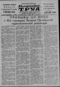 Хлеборобы района! С д а д и м в закрома Родины 4.300.000 пудов кулундинекого хлеба! ПРОЛЕТАРИИ ВСЕХ СТРАН, СОЕДИНЯЙТЕСЬ! jCbUueJcmu&Hsiu Орган Карасунсюго райкома Коммунистической партии Советского Союза и районного Совета депутатов трудящихся Новосибирской области По состоянию на 21 октября в счет обязательства с д а н о 3.831.906 пда ПРИЗЫВЫ ЦК нпсс к 41-й годовщине Великой Октябрьской социалистической революции 1. Да здравствует 41-я годовщина Великой Октябрьской социалистической революции! 2. Слава Великому Октябрю, открывшему новую эру в истории человечества— эру крушения капитализма и торжества социализма! 3. Да здравствует марксизм-ленинизм— победоносное знамя Великой Октябрьской социалистической революции! 4. Да здравствует XXI съезд Коммунистической партии Советского Союза— съезд строителей коммунизма! 5. Горячий привет коммунистичес к и м и рабочим партиям всех стран— авангарду рабочего класса и всех трудящихся в борьбе за мир, демократию и социализм! Да здравствует нерушимое братское единство и сплоченность коммунистических и рабочих партий! Выше знамя марксизма-ленинизма! 6. Боевая солидарность международного рабочего класса— залог непобедимости дела демократии и социализма. Выше знамя пролетарского интернационализма! 7. Пролетарии всех стран, соединяйтесь! 8. Трудящиеся всех стран! Пусть крепнет единство действий между всеми организациями трудящихся в борьбе за мир, демократию и социализм! Все на борьбу против опасности возникновения новой войны. Решительней разоблачайте империалистических поджигателей войны! За мир и сотрудничество между народами! 9. Народы мира! Требуйте от правительств США и Англии немедленного прекращения испытаний атомного и водородного оружия на вечные времена! 10. Народы мира! Боритесь за запрещение атомного и водородного оружия, за сокращение вооружений и вооруженных сил! 11. Братский привет всем народам, борющимся за мир, за демократию, за социализм! 12. Да здравствует могучий социалистический лагерь — несокрушимый оплот мира и безопасности народов! Пусть крепнет и ироцветает великое содружество народов стран социали стического лагеря! 13. Братский привет великому китайскому народу, строящему социализм, решительно и единодушно борющемуся против вмешательства империалистических агрессоров во внутренние дела Китая! Да здравствует нерушимая дружба и сотрудничество советского и китайского народов— могучий оплот мира во;всем мире! 14. Братский привет трудящимся Народной Республики Албании, строящим социализм! Да здравствует нерушимая дружба и сотрудничество между советским и албанским народами! 15. Братский привет трудящимся Венгерской Народной Республики, строящим социализм! Да здравствует нерушимая дружба и сотрудничество между советским и болгарским народами! 16. Братский привет трудящимся Болгарской Народной Республики, строящим социализм! Да здравствует нерушимая дружба и сотрудничество между советским и венгерским народами! 17. Братский привет трудящимся Демократической Республики Вьетнам, строящим социализм, борющимся за национальное объединение своей страны на демократических началах! Да здравствует нерушимая дружба и сотрудничество между советским и вьетнамским народами! 18. Да здравствует Германская Демократическая Республика— оплот миролюбивых сил всей Германии в борьбе