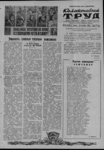 • г V ПРОЛЕТАРИИ ВСЕХ СТРАН, СОЕДИНЯЙТЕСЬ! ICbUueJcnusMHsui * т щ щ т МПОПРШ Умножать сливныетрдаици комсомола Вместе с комсомольцами, молодежью 29 октября 'отмечает весь советский народ сорокалетие Ленинского комсомола. Легендарным героизмом, неутомимой борьбой за новую, счастливую жизнь, за дело партии, за коммунизм наполнена вся история комсомола. Верой и правдой служит он родному народу, является надежным помощником и резервом Коммунистической партии. 67 миллионов юношей и дедушек прошли школу воспитания в Союзе молодежи. Это— несколько поколений, и от одного к другому передаются славные традиции комсомола— горячо откликаться на зов Родины, быть там, где трудно, в любом деле проявлять свою инициативу и почин, во всем следовать за партией. * * Молодежь—важная часть революционных сил народа. Так считали коммунистическая партия, великий Ленин. Они стояли у колыбели рабоче- крестьянского юношеского движения России. Грозный 1918 год. 29 октября состоялся первый съезд комсомола. Он объединил все социалистические союзы и rpfntju молодежи в единый Российский Коммунистический Союз молодежи. Провозглашены цели союза: распространять идеи коммунизма, вовлекать рабочую и крестьянскую молодежь в активное строительство Советской России. Империалисты и внутренняя контрреволюция пытались задушить молодую- Советскую республику. Вместе со всем трудовым народом комсомол героически отстаивал завоевания Великого Октября. 1920 год. Еще гремят над Родиной залпы орудий, а Владимир Ильич Ленин, заглядывая в будущее, с трибуны III съезда комсомола ставит перед молодым поколением задачу— построить коммунистическое общество, овладеть всеми современными знаниями, соединить учебу с Трудом рабочих и крестьян. Со всей энергией молодости помогают комсомольцы восстанавливать разрушенное войной народное хозяйство. 1924 год. Безмерное горе постигло советский народ— умер Владимир Ильич Ленин. VI съезд РКС-М принял постановление: именовать комсомол Ле- ☆ ☆ ☆ К. МУРТАЗАЕВ Секретарь ЦК ВЛКСМ V V V нинским. Решение это, как говорилось в обращении съезда к молодежи, принято для того, чтобы вся трудящаяся молодежь прониклась единой волей и твердой решимостью научиться по-ленински жить, работать и бороться. Комсомол верен этой клятве. В годы первых пятилеток юноши и девушки с энтузиазмом трудятся на всех стройках страны. В эти годы комсомол— инициатор и застрельщик массового социалистического соревнования и ударничества. Преодолевая огромные трудности, советский народ под руководством Коммунистической партии первым в истории построил социализм. Комсомол счастлив, что в этом есть доля и его труда. 1941 год. Фашистские захватчики вероломно напали на нашу мирную Родину. Вместе со всем народом на ее защиту грудью встали и молодые патриоты. На фронте и в тылу комсомольцы, юноши и девушки проявляют массовый героизм и самоотверженность. В память народа навсегда вошли имена бесстрашных молодых героев Александра Матросова, Юрия Смирнова, Зои Космодемьянской, Лизы Чайкиной, Олега Кошевого и тысяч других. За выдающиеся заслуги в годы Великой Отечественной войны ВЛКСМ награждается орденом Ленина. 3,5 миллиона юношей и девушек удостаиваются орденов и медалей Советского Союза. 7 тысяч комсомольцев и воспитанников комсомола получают звание Героя Советского Союза, 60 человек станов