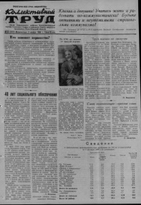 ПРОЛЕТАРИИ ВСЕХ СТРАН, СОЕДИНЯЙТЕСЬ! 1CbUU£JcrnU&HGOl Орган Карасукского райкома Коммунистической партии Советского Сотза и районного Совета депутатов ___ трудящихся Новосибирской области №132(2472^ 1ВоскоесРньр, 2 ноября 1958г. ?Пена15 коп. Юноши и девушки! Учитесь жить и работать по-коммунистически! Будьте активными и неутомимыми строителями коммунизма! (Из Призывов ЦК КПСС к 41-й годовщине Великой Октябрьской социалистической революции). Кто завоюет первенство? Среди рабочих элеваторов и хлебоприемных пунктов нашей области началось соревнование за быстрейш ую обработку, сушку и надежную сохранность хлеба нового урожая. Президиум обкома профсоюза рабочих и служащих сельского хозяйства и заготовок и областное управление хлебопродуктов поддержали инициативу. Утверждены условия социалистического соревнования коллективов сушильных бригад элеваторов и хлебоприемных пунктов. Победителями в соревновании будут считаться те коллективы сушильных бригад, которые обеспечат: выполнение и перевыполнение ежесменных заданий сушки зерна, установленных в тоннах для каждого типа зерносушилки; строгое соблюдение правильного технологического режима сушки без снижения количества и качества клейковины и без ухудшения качества зерна (поджаривания, запаривания, дымового запаха и др.). Итоги соревнования определятся по состоянию на 15 ноября, 1 декабря, 1 января. Победители будут награждаться почетными грамотами. За достижение лучш их результатов установлено 30 денежных премий: 6 первых премий— по 1000. рублей, 9 вторых премий— по 600 рублей, 15 третьих премий— по 500 рублей. 40лет социального обеспечения 31 октября исполнилось 40 лет со дня подписания В. И. Лениным ^декрета Совета Народных Комиссаров о социальном обеспечении трудящихся. После октября 1917 года человек труда в нашей стране впервые познал себя полноправным гражданином. Забота о нем стала государственным делом. Социализм строится трудящимися для самих себя. .«Кзе что создано у нас, все великие достижения нашей страны-освоение целины и запуск в космос искусственных спутников Земли, строительство новых городов и гидроэлектростанций, сокращение рабочего дня и увеличение размеров государственных пенсий— все это делается во имя советского человека, для того, чтобы жизнь его была еще богаче и радостнее. В июле 1956 года пятая сессия Верховного Совета ‘Союза ССР приняла новый Закон о государственных пенсиях, реализация которого значительно улучшила материальное благосостояние миллионов людей, увеличила их доход. Это акт большой государственной важности. В нем нашли свое отражение высокий гуманизм социалистического строя и исторические успехи, достигнутые советским народом под руко- в о д с т в о м Куммунистической партии. Размеры пенсий по новому закону увеличились в 3— 4 и больше раз по сравнению с ранее существовавшими нормами. Общий расход государственных средств на пенсионное обеспечение трудящихся только по нашему району составил за 10 месяцев текущего года свыше семи миллионов рублей, что в два с лишним раза превышает сумму годоПо 4.361 кг. молока от каждой коровы Труд оценен по заслугам вого расхода за весь 1956 год. Свыше пяти тысяч человек получает в районе пенсии и пособия. А ведь кроме этого значительное число населения получает такие пенсии по линии министерства обороны, пром- страхсове