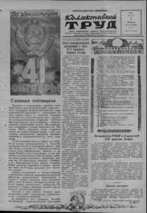 % Славная годовщина Радостно и торжественно отмечает советский народ свой знаменательный праздник— 41-ю годовщину Великой Октябрьской социалистической революции. У трудящихся нашей страны вошло в чудесную традицию встречать эту знаменательную дату высокими производственными подарками. Особенно ярко разгорелось предоктябрьское социалис- тическое соревнование нынче. Воодушевленные сообщением о созыве внеочередного XXI . съезда КПСС, советские люди стараются внести как можно больший вклад в дело увеличения производства продуктов сельского хозяйства и промышленности на душу населения, Свой достойный вклад в общее дело борьбы за подъем промышленности и сельского хозяйства внесли и трудящиеся нашего района. Район досрочно и с перевыполнением вы полнил план хлебозаготовок, засыпав в за крома Родины около 4 миллионов пудов добротного кулундинского хлеба. В период хлебозаготовок особо отличились труженики колхоза им. XX партсъезда, совхозов „Октябрь** и им. Дзержинского и ряд других хозяйств. Район досрочно справился с планом заготовок мяса, на 95 проц. выполнил план заготовок шерсти. Хорошо потрудились в предоктябрьском соревновании рабочие, инженерно-технические работники промышленных предприятий и строек. С честью выполнил свои обязательства в честь Великого Октября коллектив рабочих завода строительных материалов, Он досрочно, 4 ноября, завершил годовой план по выпуску валовой продукции. Сегодня, в день юбилея Октября шлем пламенный привет передовикам промышленности и сельского хозяйства. Да здравствует 41-я годовщина Великой Октябрьской социалистической революции! Бюро Р К К П С С и исполком районного Совета депутатов трудящихся подвели итоги предоктябрьского социалистического соревнования. Первенство в соревновании среди колхозов района присуждено сельхозартели им. X X партсъезда, одной из первых закончившей уборку урожая, выполнившей план хлебозаготовок на 123 проц., полностью засыпавшей семена зерновых культур и выполнившей план подъема зяби на 56 проц. Колхозу вручено переходящее Красное знамя Р К К П С С и райисполкома и он занесен на районную Д о ску почета. В соревновании совхозов первенство завоевал совхоз „О ктябрь1, сдавший го су дарству 875 тысяч пудов хлеба. Совхозу присуждено переходящее Красное знамя Р К К П С С и райисполкома, и он занесен на районную Д о ску почета. Бюро и исполком отметили хорош ую работу на уборке урожая и хлебозаготовках коллектива рабочих совхоза им. Дзержинского (директор К. Сиротинский, секретарь парторганизации В. Ти монов), выполнившего план хлебозаготовок на 138,1 проц. и полностью засыпавшего семена зерновых к ул ь тур под урожай 1959 года. Отмечена, также хорошая работа на уборке урожая и хлебозаготовках восьмой фермы совхоза „Октябрь". Первенство в социалистическом соревновании промышленных предприятий завоевал коллектив Карасук- ского завода строительных материалов, выполнивший 4 ноября годовую производственную программу. Заводу вручено переходящее Красное знамя райкома К П С С и райисполкома, и он занесен на районную Д о ску почета. Большая группа передо виков сельского хозяйства и промышленности награждена Почетными грамотами райисполкома и многие из них занесены на районную Д о ску почета. К олхоз ин. XX партстьездя (председатель И. Ларченко, секретарь парторганизации