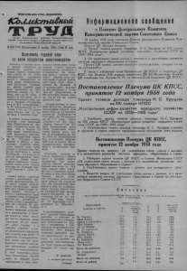 ПРОЛЕТАРИИ ВСЕХ СТРАН, СОЕДИНЯЙТЕСЬ! iCaUueJcmu£mm Информационное сообщение OpiaH Карасукеньги райкома Коммунистической вдртив Советского Союза и районного Совета депутатов трудящихся Новосибирской области №137(2477?[Воскресенье,16 ноября 1958г.?Цена 15 коп. Выполнить годовой план по всем продуктам животноводства о Пленуме Центрального Комитета Коммунистической партии Советского Союза 12 ноября 1958 года состоялся Пленум Центрального Комитета Коммунистической партии Советского Союза. Пленум ЦК обсудил вопросы: 1. Проект тезисов доклада товарища Н. С. Хрущева на XXI съезде КПСС „Контрольные цифры развития народного хозяйства СССР на 1959—1965 годы". 2, Об укреплении связи школы с жизнью и о дальнейшем развитии системы народного образования в стране. Пленум ЦК принял соответствующие постановления, которые сегод- Колхозы и совхозы наше- сколько километров. Скармго района, соревнуясь за лнвание сеяных трав про- няп у б л и к ую т с я . достойную встречу XXI изводилось не загонками, а ' „ Т11/, r ik ’ сьезда партии, направляют беспорядочно. Так, напри- Ц связи с избранием члена Президиума ЦК К П С С и с е к р е т а р я Ц К свои усилия на то, чтобы мер, было в совхозе „Ок- КПСС тов.Беляева Н,И. первым секретарем ЦК КП Казахстана, Пленум своевременно произвести тябрь”. Поэтому здесь низ- ЦКосвободил тов. Беляева Н. И. от обязанностей секретаря ЦК КПСС, расчёт с государством по кий надой и плохая упитанвсем видам животноводче- ность скота. Тоже самое в ской продукции. Тружени- колхозе им. Жданова. За ки района годовой план 10 месяцев здесь получено мяса выполнили на 100.6 на 250 центнеров, а в совпроцента, молока —на 91,1 хозе им. Дзержинского на проц., яиц-—на 82 проц. и 865 центнеров молока меньшерсти на 95,6 проц. За 10 ше, чем за этот же период месяцев текущего года еда- прошлого года, но и продано государству мяса на 65,6 тонны,молока-- Позорно отстают по сдаче Постановление Пленума ЦК КПСС, принятое 12 ноября 1958 года Проект тезисов доклада товарища Н. С. Хрущева на XXI съезде КПСС на 82 тонны,шерсти—на 7 7 яйи-а колхоз им. Джамбула, . , . ______ _______ тонны и яиц на 272 тысячи выполнивший годовой план „КоНТрОЛЬНЫв Цифры раЗВИТИЯ НарОДНОГО ХОЗЯИСТВа штук больше, чем на эту всего лишь на 2,3 процента, СССР На 1959— 1965 ГО ЛЫ " же дату в прошлом году. колхоз им. Куйбышева—на ^ 17,5 проц., им. XX партсъез- . _ . л v В районе немало хозяйств, да—на 17,7 проц., совхоз 1- Одобрить проект тезисов докладатоварища Н. L. Хрущева которые уже выполнили „Октябрь1—на 16,5 проц., на XXI съезде КПСС .Контрольные цифрыразвития народного хозяйсвои обязательства по про- „Заветы Ильича”—на 20,3 ства СССР на 1959—1965 годы“. дз* е Г° сУДарСТВу Мяса’ Пр°Ц Невыволнение плана 2. Опубликовать тезисы доклада товарища Н, С. Хрущева в печати лока, яиц и шерсти. По этими хозяйствами объяс- J г всем видам животноводче- няется прежде всего тем, и провести в стране широкое предсъездовское обсуждение этих тезисов, ской продукции рассчита- что на птицефермах не бы- ---------------------------------- --------- ------------ ------------:— лись с государством колхо- ло учёта за яйценоскостью зы им. Тельмана, „Маяк кур, отсутствовал надлежа- Ильича” и „Вперед к ком- щий уход за птицей, она не мунизму”. Досрочно завер- подкармливалась минераль- шили годовой план сдачи ными и витаминными кор- молока и мяса колхозы име- мами. ни XX партсъезда и имени Куйбышева, П е р е к р ы л а Некоторые план по производств