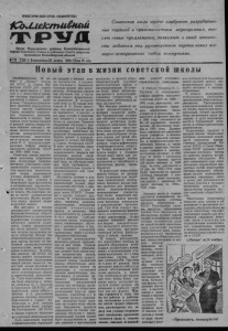 ПРОЛЕТАРИИ ВСЕХ СТРАН, СОЕДИНЯЙТЕСЬ! 4CbUu£Jcmu4H&u Орган Карасукского райкома Коммунистической партии Советского Союза и районного Совета депутатов трудящихся Новосибирской области №ИЗ ( 2 С М Воскресенье,30 ноября 1958г.Н1ена 15Топ Советские люди горячо одобряют разработанные партией и правительством мероприятия, вносят новые предложения, заявляют о своей готовности добиться под руководством партии новых все- мирно-исторических побед коммунизма, Новый этап в жизни советской школы У Опубликованные 16 ноября в „Правде “ тезисы ЦК КПСС и Совета Министров СССР „Об укреплении связи школы с жизнью и о дальнейшем развитии системы народного образования в стране”, одобренные Пленумом Центрального Комитета Коммунистической партии Советского Союза, являются документом огромного значения. Выдвинутая в тезисах программа перестройки средней и высшей школы самым тесным образом связана с новыми величественными задачами коммунистического строительства, намеченными в тезисах доклада товарища Н. С. Хрущева о контрольных цифрах развития народного хозяйства СССР на 1959—1965 годы. Советская школа подготовила миллионы образованных. культурных граждан, активных участников социалистического строительства. Она вырастила замечатель ные кадры выдающихся ученых, инженеров, конструкторов, чьи искания и творческий труд воплощены в исторических научно-технических победах Советско- * го Союза. Но советские люди не могут успокаиваться достигнутым. Жизнь выдвигает перед школой новые возросшие задачи. Мы вступаем в период развернутого строительства коммунистического общества.Ближайшие и дальнейшие перспективы технико-экономического развития Совет ского Союза предъявляют все более высокие требова ния ко всем труженикам нашего общества. Между тем общеобразовательная и высшая школы отстают от требований коммунистического строительства, имеют серьезные недостатки. В отчетном докладе ЦК КПСС XX съезду партии указывалось, что серьезным недостатком нашей школы является известный отрыв обучения от жизни плохая подготовленность оканчивающих школу к практической деятельности. Пути перестройки школы были намечены в записке товарища Н. С. Хрущева в Президиум ЦК КПСС „Об укреплении связи школы с жизнью и о дальнейшем развитии системы народного образования в стране”. Изложенные в этой записке предложения были одобрены Президиумом ЦК КПСС и нашли горячую поддержку советской общественности Суть намеченной партией и правительством перестройки средней и высшей шко- молодежи, в средней обще- ших условий успешного лы заключается в соедине- образовательной трудовой строительства коммунизма, нии обучения с производи- политехнической школе с - тельным трудом при непре- производственным обучени- менном повышении уровня ем (типа школ фабрично- как обучения, так и воспи- заводского и сельскохозяйственного ученичества), в техникумах, работающих на базе восьмилетки. Все большее развитие получат школы-интернаты, в которых создаются наиботания нашего подрастающе го поколения. В исторической речи на III съезде комсомола В. И. Ленин разъяснял, что молодежь не должна замыкаться в школах, а все свое учение и образова- лее благоприятные условия В тезисах товарища Н. С. Хрущева о контрольных цифрам развития народного хозяйства СССР на 1959 — 1965 годы намечается значите