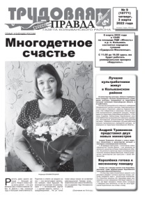 Основана 5 марта 1932 года 16+ № 9 (10771) четверг, 3 марта 2022 года СЕМЬЯ И БУДУЩЕЕ РОССИИ Многодетное счастье Растить даже одного малыша — большая радость. Когда в семье сразу много детей — это уже великий дар и благословение небес. И, вместе с тем, огромный труд и большая ответственность. Родители в ответе за к аждого из них — они воспитывают маленьких граждан, наше будущее. На многодетных смотрят по-разному: одни — с восхищением, другие — с к аплей зависти, третьи — с предубеждением… Но уж точно такие семьи никого не оставляют равнодушными! Пример этому - замечательная семья Кониболоцких из деревни Чаус Колыванского района. (Окончание на 10-й стр.) Лучшие культработники живут в Колыванском районе В министерстве культуры области подведены итоги конкурса «Лучшие муниципальные учреждения культуры, находящиеся на территориях сельских поселений Новосибирской области, и их работники». Коллектив муниципального казенного учреждения Объединенного центра культуры Новотырышкинского сельсовета «Гармония», директор Людмила Волчкова, стал победителем в номинации «Лучшие сельские муниципальные учреждения культуры, находящиеся на территории Новосибирской области». А Наталья Андреева, библиотекарь Воробьевской сельской библиотеки муниципального казенного учреждения «Колыванская централизованная библиотечная система», победила в номинации «Лучшие работники сельских муниципальных учреждений культуры, находящихся на территории Новосибирской области». Андрей Травников представил двух новых министров Андрей Травников объявил о новых кадровых назначениях в министерстве юстиции и миннауки и инновационной политики. С 28 февраля приступила к исполнению новых обязанностей Татьяна Деркач – она назначена на должность министра юстиции Новосибирской области. На должность министра науки и инновационной политики назначен Вадим Васильев. Новый руководитель министерства уже приступил к своим обязанностям. Королёвка готова к весеннему паводку Готовы ли к паводку жители села Королёвка, рассказал глава администрации Королёвского сельсовета Василий Войтенко: - В этом году снега относительно немного и его регулярно убирают. Согласно прогнозу погоды, снегопад ожидается ещё в достаточном количестве. По статистике прошлых лет, Королёвка редко оказывалась в зоне наводнения. Всё будет зависеть от того, как будет проходить таяние снега. Ситуация с паводком пока непонятна, но всё же, если будет угроза подтопления, мы готовы к этому. Надежда КОНИБОЛОЦКАЯ. 6 марта 2022 года в 12:00 на площади РДК «Юность» в р. п. Колывань состоится народное гуляние «Сударыня Масленица». С 11.00 до 16.00 здесь же будет работать универсальная ярмарка «Карусель».