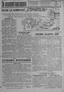 о а С У .Ю Ш Я УЮ 'НТК И в п 'Ш и т и и / г и ю СВ л /^ н и г п и и,)лиъши1У . & ------- •• ---------- —' — КРЕСТЬЯНСКАЯ ГЯЗЕТЙ ТНТЯРСКОГО РЯЙКОМЯ ВКП(б), РАЙИСПОЛКОМА и РЯЙПРОФСОВЕТЯ Подписная плата на газету 20 коп. в месяц, для учреждений—40 коп. Подписка принимается в конторе редакции, в почтовых отделениях г. Татарска и Юднно. 1330 Г. СЕНТЯБРЬ 1930 г, 23 ВТОРНИК Выходит один раз в пятидневку ...... М П - . - , ■ - ................ Адрес редакции: гор. ТатарокВ,олодарская. Ш 2 . БЕГОМ ЗА КОММУНОЙ ^СТРОИТЕЛЬ“ Сентябрьский план хлебозаготовок должен быть выполнен во что бы то ни стало. По почину коммуны „Строитель“ , скажем:— Наш встречный план возьмет на буксир отставших ПОДРАЖАЙТЕ ЙМ Середняк деревни Ново-Возне- сенки Эсманский дал обещание досрочно выполнить и перевыполнить взятое им на себя обязатель’ ство по сдаче хлеба государству. Эсманский один из первых в деревне приступил к сдаче хлеба государству. Знающий. Коммуна „Безбожник“ по-бое- вому организует хлебозаготовительную кампанию. Предполагается к первому октября план целиком выполнить и перевыполнить. Коммунары внесли предложение организовать ударные бригады по хлебозаготовкам и бросить их в помощь единоличникам. Коммунар. В Камышинке принят и утвержден план хлебозаготовок. В постановлении общего собрания говорится: — Дать твердое задание по сдаче хлеба государству каждому кулацко-зажиточному хозяйству категорически предложить им не медленно приступить к выполнению плана. Крестьянин, Из Красноярки сообщают, что там принят план хлебозаготовок. Не ограничиваясь этим, общее со брание постановило поставить задачей переЕыполнение плана так, чтобы каждый двор добивался сдачи хлеба государству сверх принятого плана. Зоркий, В Чаны-Сакановском сельсовете хлебозаготовки в разгаре. На первом общем собрании план был принят в два раза выше, чем намечено райисполкомом. Общее собрание заявило, что оно ео что бы бы то ни стало этот план выполнит. Казак. Выполнив хлебозаготовки, двинем вперед строительство молочно-животноводческих колхозов 23 СЕНТЯБРЯ Н0В0-3ВНЕНСКСИИСЕЛЬСОВЕТ НА КУЛАЦКОМ ПОВОДУ Из дер. Ново-Вознесенки, Татарского района, нам сообщают, что сельсовет совершенно не руководит хлебозаготовками, бросив их на произвол судьбы. Принятый план хлебозаготовок сельсоветом забыт. До кулацко-зажиточного хозяйства план все еще не доведен. Как и следует ожидать, от такой работы сельсовета сентябрьский план на сегодняшний день поставлен перед вопросом: будет сорван или нет? Если сельсовет не проснется и не приступит по-боевому за хлебозаготовки, то план, конечно, выполнен не будет. Кулаки активно агитируют про тив выполнения хлебозаготовок, не встречая никакого отпора. Ново Вознесенский сельсовет должен быть немедленно обследован. Нет никакого сомнения в том, что в сельсовете сидят кулацкие защитники, вредители хлебозаготовок, не желающие выполнять директивы партии и правительства. Бедняк. СЛУШАЙТЕ, КОЛХОЗНИКИ! Откртоыеписьмокоммуны „Строитель“ ко всемколхозным объединениям Татарского района — Мы переживаем поистине исторический момент. Через несколько дней страна советов, под руководством коммунистической партии, вступает в третий год великой пятилетки. За два года рабочий класс, под руководством партии, приобрел гигантские достижения. Сельское хозяйство за это время выросло и окрепло. Сейчас пров